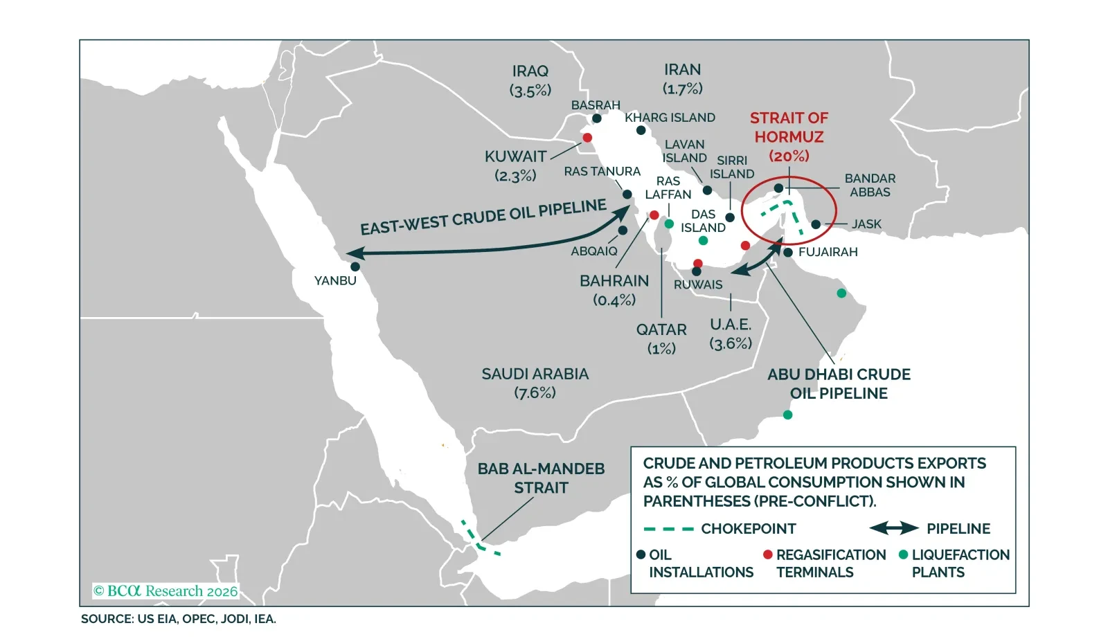 Around 20% of oil and products flowed through the Strait of Hormuz in 2025. The longer that tanker traffic through the strait is constrained, the worse the global energy supply shortage.