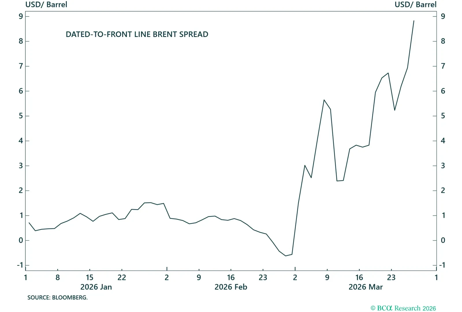 The dated-to-front line Brent spread measures the difference between the physical dated Brent price and the frontline Brent futures price, signaling a tightness in the spot market.