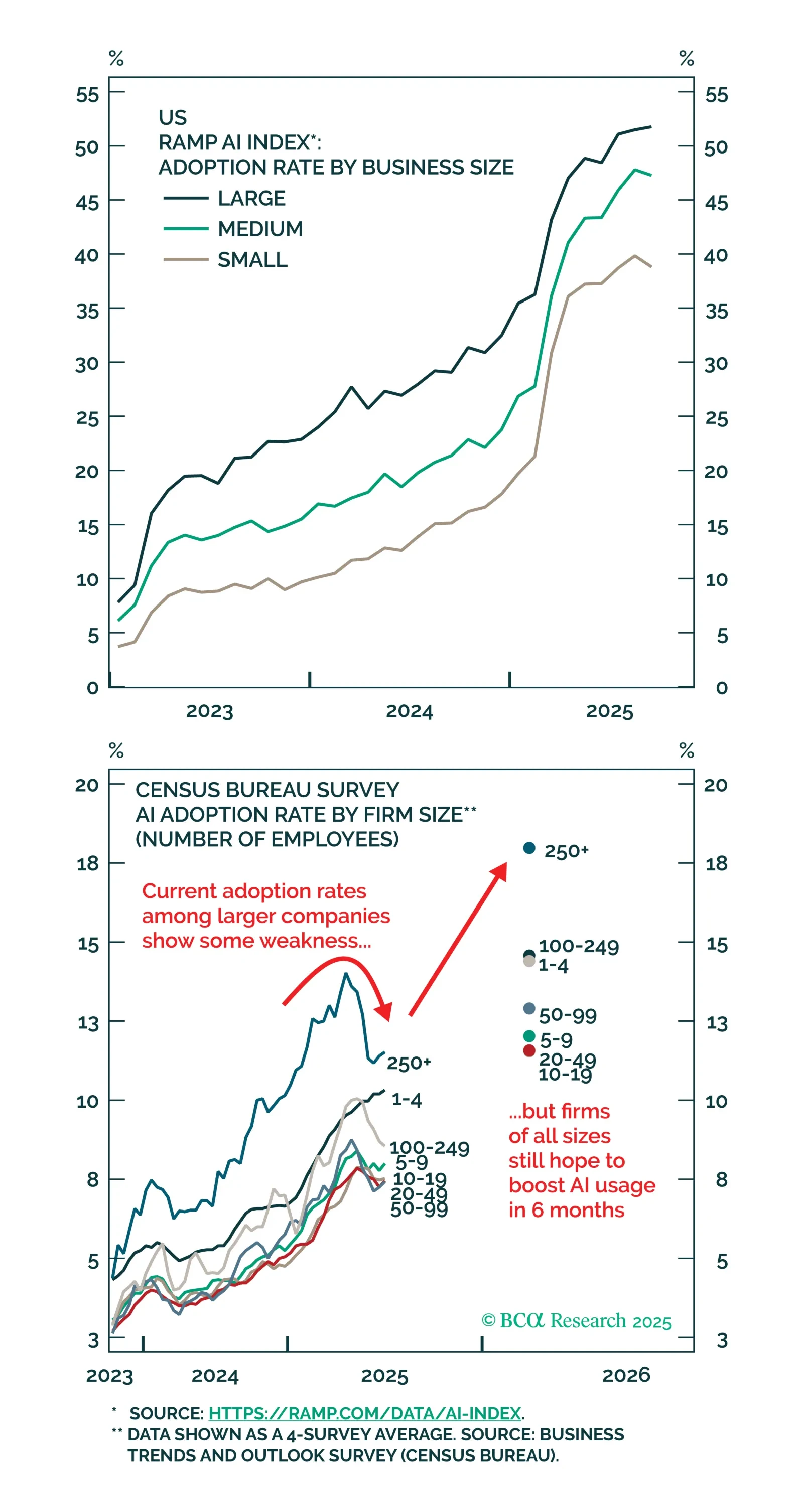 In the case of AI, most companies say that they intend to increase usage. However, actual adoption rates appear to be plateauing, and by some measures, have even dipped in recent months (Chart 10). We see this as a yellow flag for the AI trade.