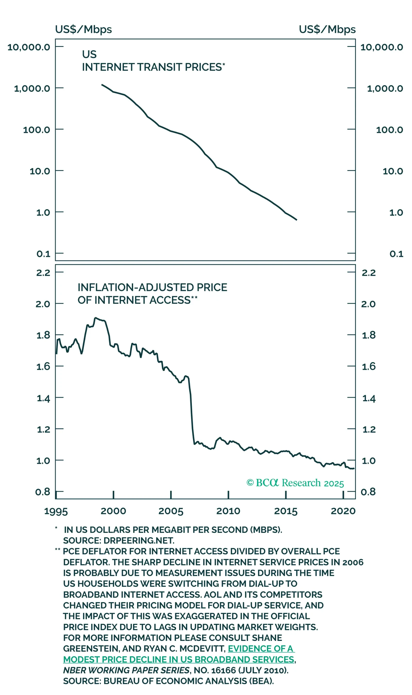 While slowing adoption is one reason why capex booms often turn into busts, an equally important reason is price deflation. The internet is a case in point. Internet traffic grew by an average of 67% annualized between 1998 and 2015; however, the price of transmitting one bit of information fell just as quickly (Chart 11). As a result, the real monthly cost of a broadband connection declined modestly.