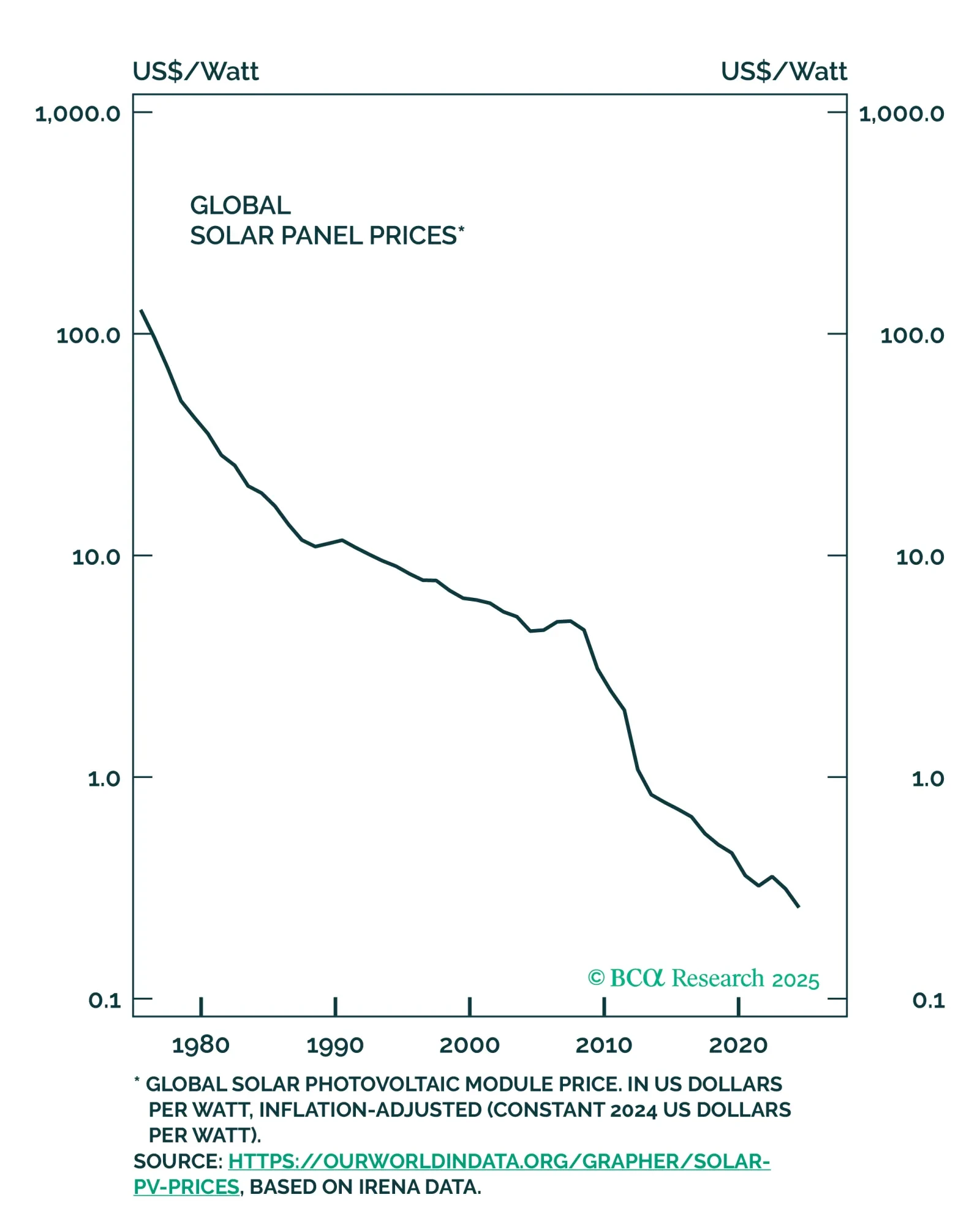 The same deflationary dynamic occurred in the solar industry. Prices of solar panels have been falling steadily since they were introduced, dropping by 95% since 2007 alone (Chart 12).