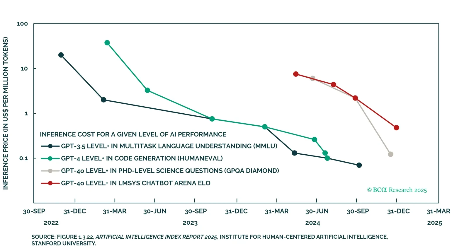 AI is unlikely to be any different. The introduction of faster chips and better algorithms has already caused token prices to fall by more than 99% since 2023 (Chart 13).