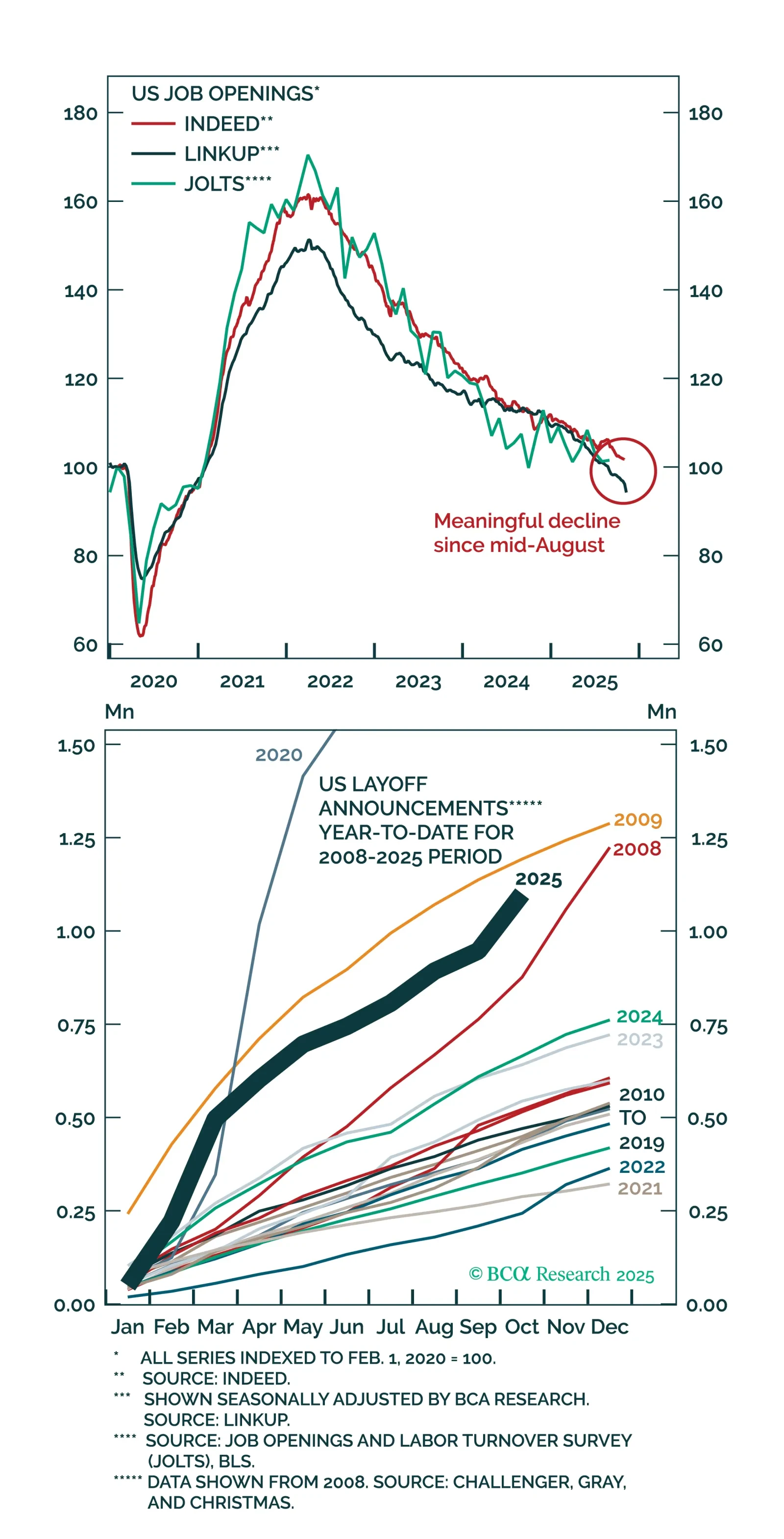 The fact that job openings have fallen to five-year lows and layoffs have picked up despite the tailwind from the AI capex boom and rising stock prices suggests that the economy will struggle if the AI trade sours (Chart 18).