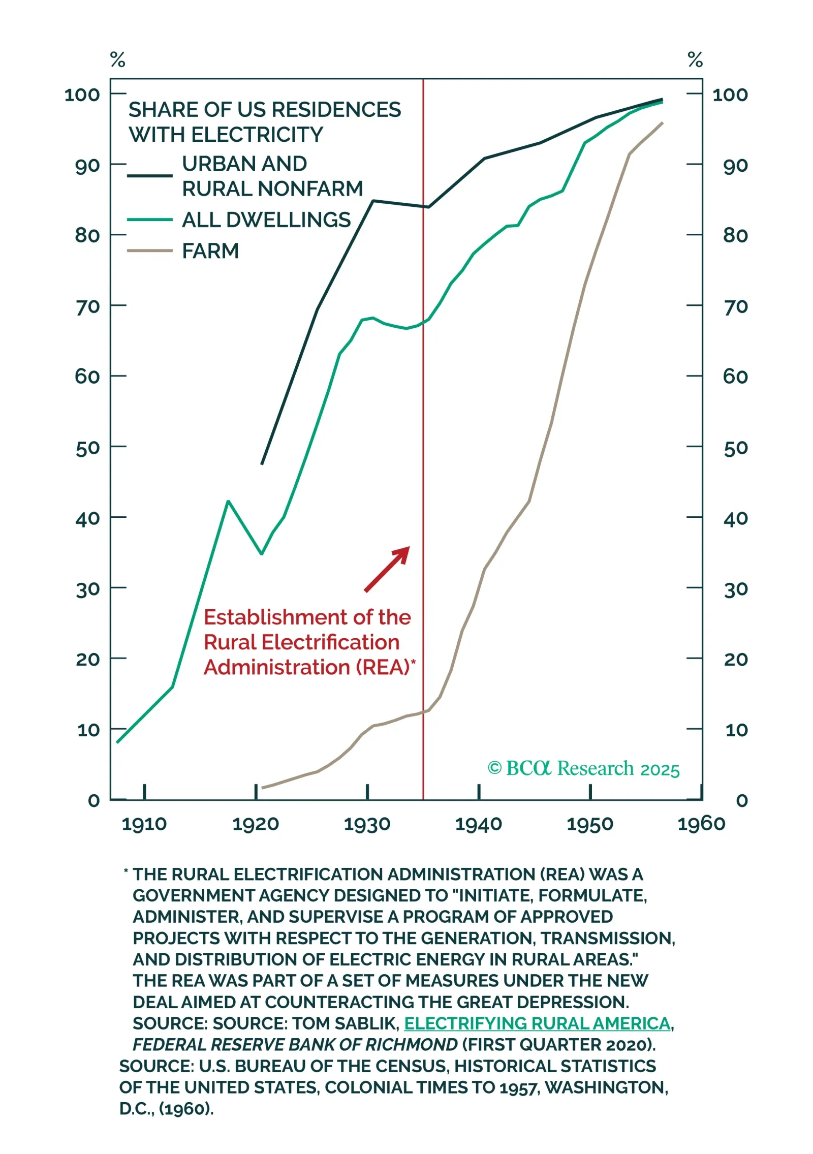 The share of US households with access to electricity rose from 8% in 1907 to about 35% in 1920 and 68% by 1930. The rollout was concentrated in urban areas, with rural electrification lagging behind until the New Deal arrived (Chart 3).