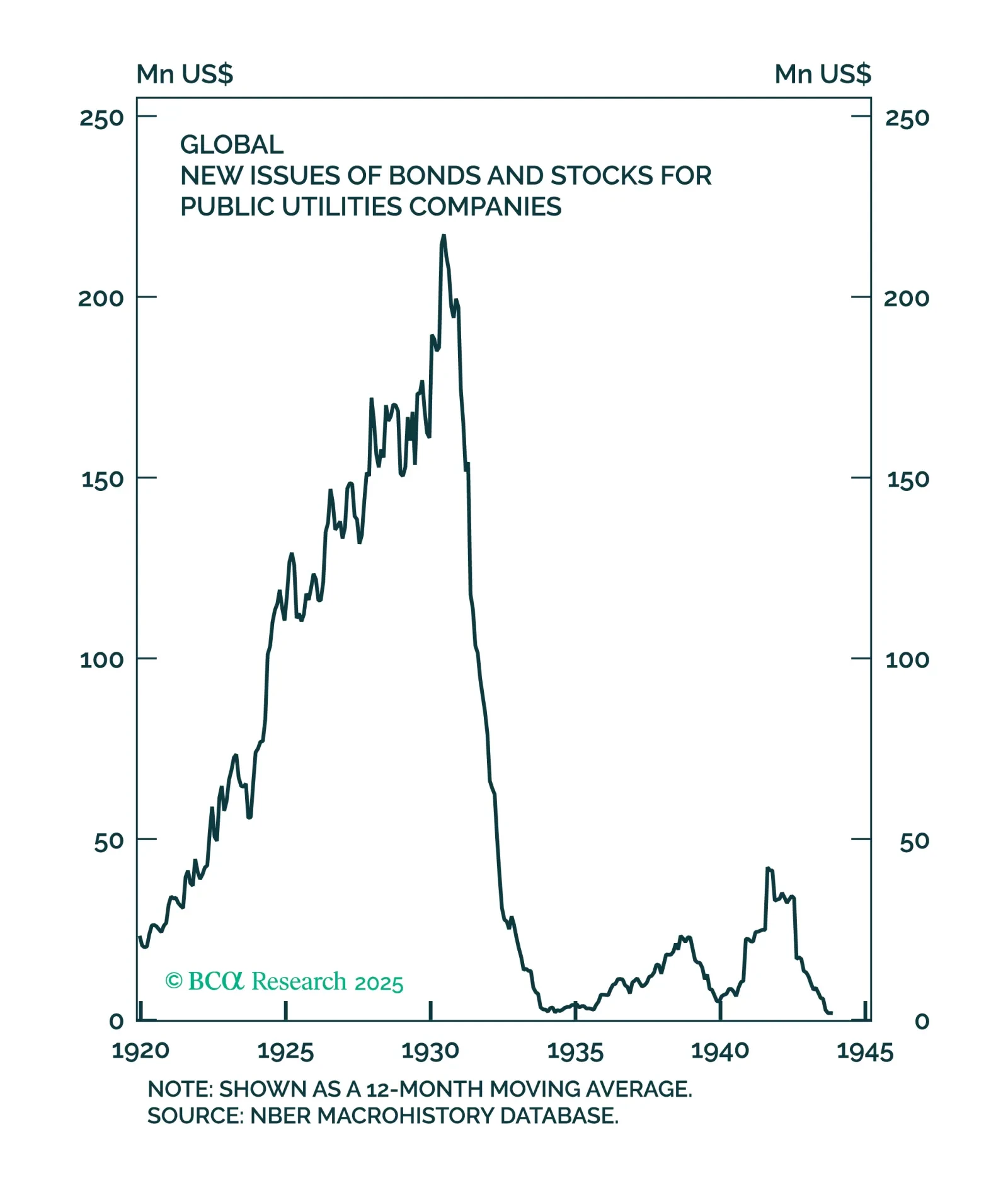 US electric utility construction outlays peaked in 1930 at about $919 million, before plunging to $129 million in 1933.