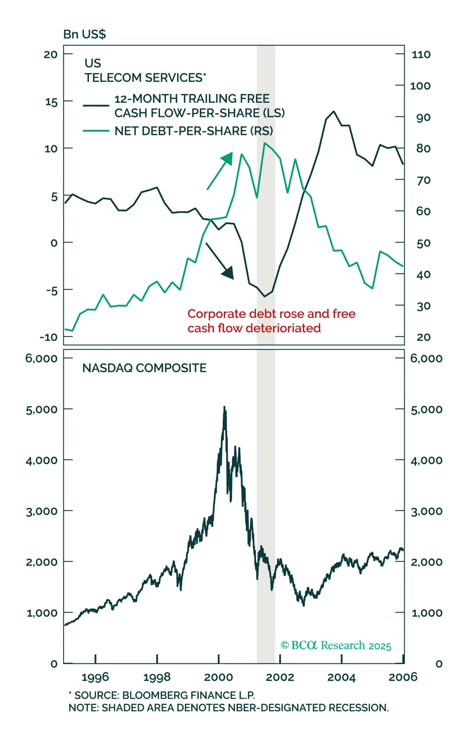 Tech-related capital spending rose from 2.9% of GDP in 1992 to a peak of 4.5% in 2000 (Chart 6). The surge in spending put pressure on corporate balance sheets. Corporate debt rose while free cash flow deteriorated. Free cash flow among telecom companies peaked in late 1997 and then fell for two straight years before plunging in 2000 (Chart 7). After rising sixfold between 1995 and 2000, the Nasdaq Composite dropped by 78% over the next two and a half years.