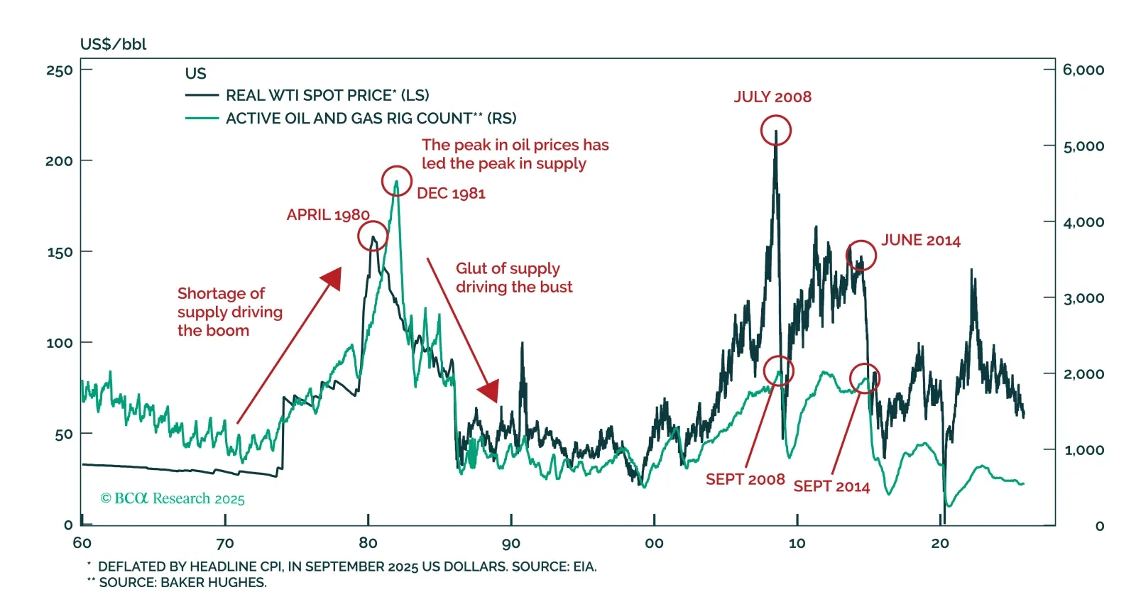 The 1970s oil booms were driven by supply restraint by OPEC and mounting geopolitical risk. The resulting increase in prices incentivized the production of more fuel-efficient vehicles. It also catalyzed new supply growth, ranging from the North Sea to Alaska to the Gulf of Mexico and the USSR. The increase in alternative sources of supply ultimately set the stage for Saudi Arabia’s decision in 1985 to abandon output restraint. This caused prices to briefly fall to $10/bbl.