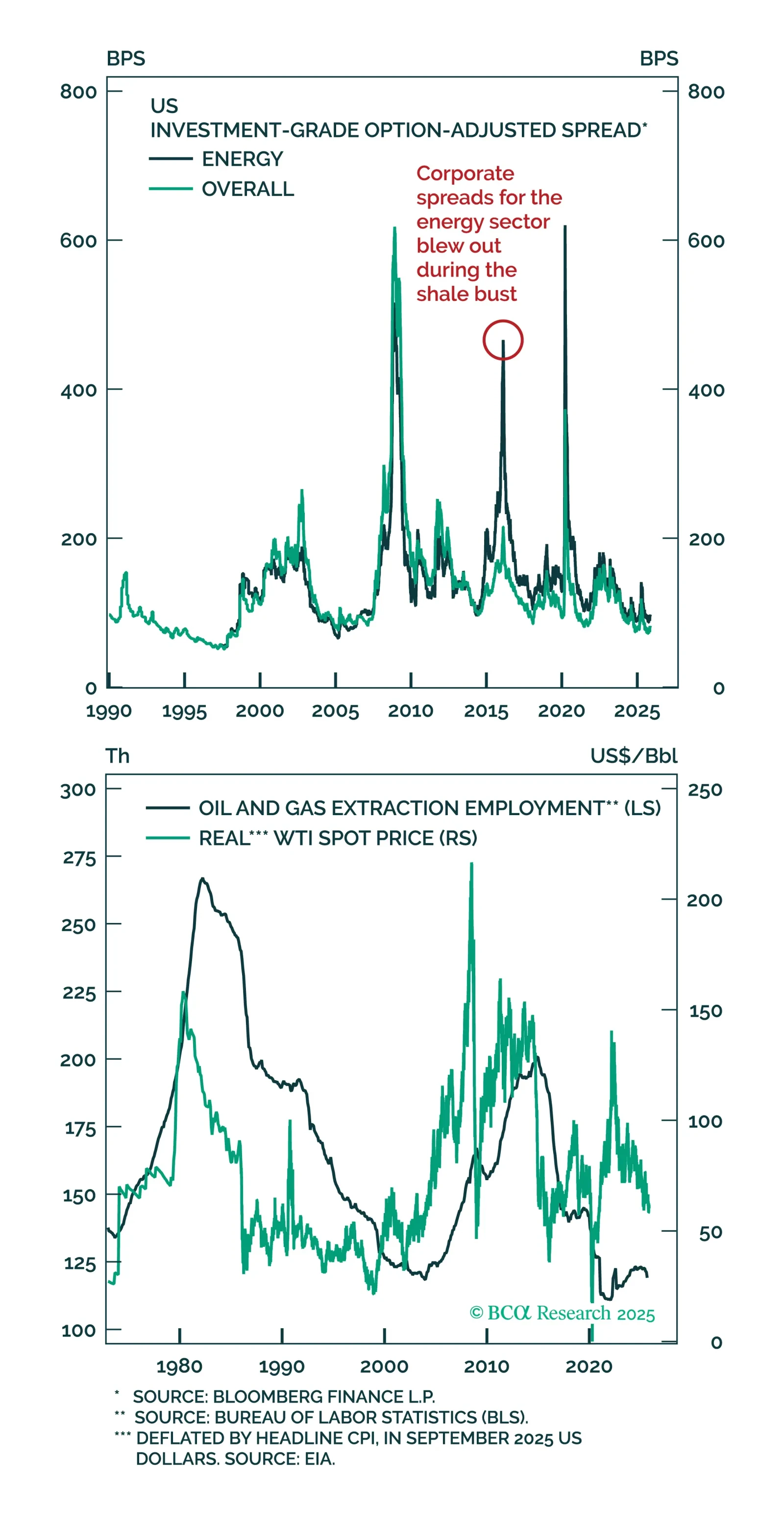 These boom/bust dynamics were echoed 30 years later during the US shale boom. US crude production rose from around 5 mb/d in 2008 to 9.4 mb/d in 2015. In order to avoid further losses in market share, OPEC refrained from cutting production at its November 27, 2014 meeting. As a result, oil prices fell from around $115/bbl in mid-2014 to $57/bbl by the end of that year. Credit spreads of energy companies blew out, and employment in the sector dropped sharply (Chart 9).