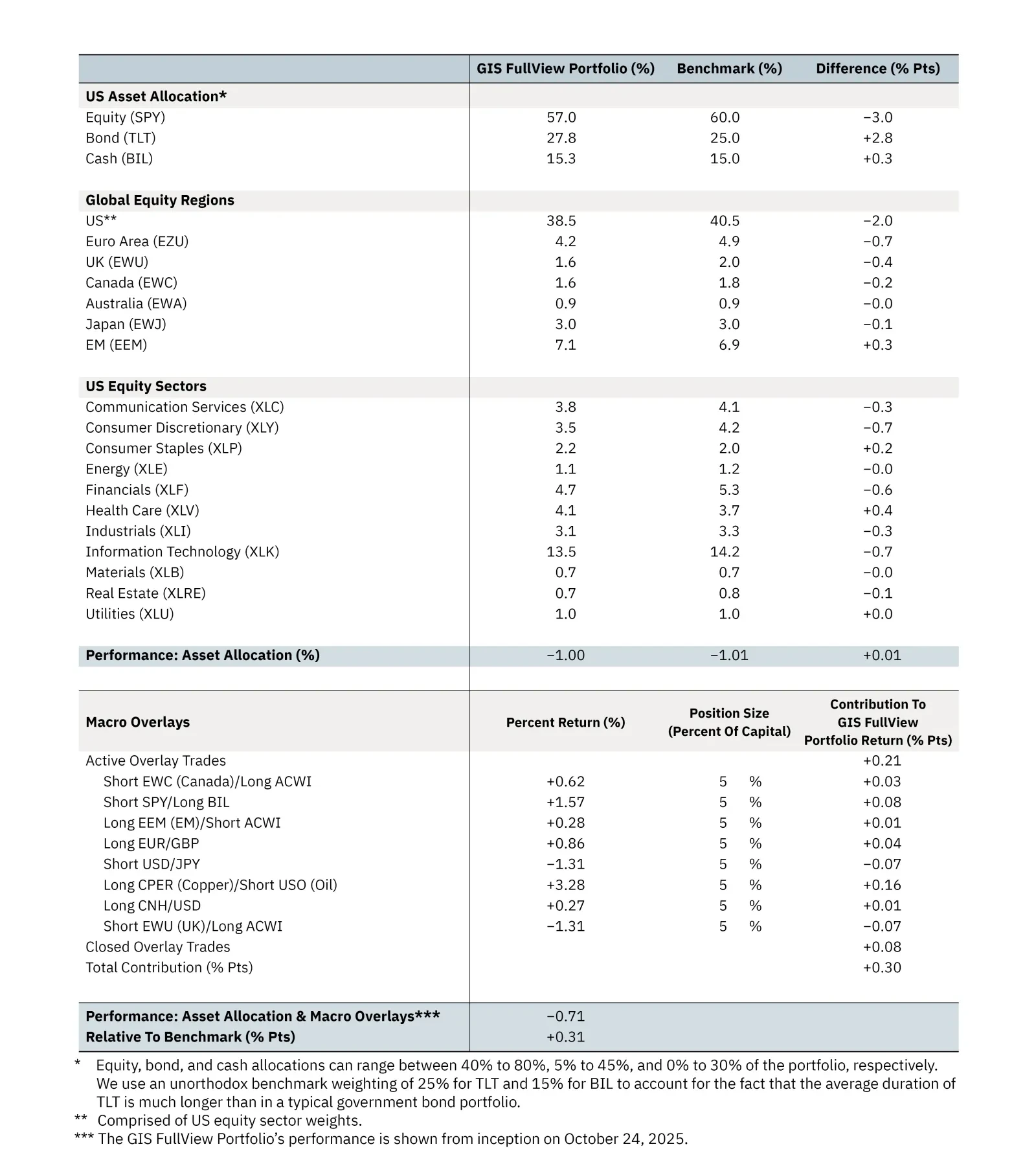 The GIS FullView Portfolio brings together our global asset allocation views, reflecting both our tactical (3-month) and cyclical (12-month) recommendations, along with the profit and loss from tactical macro trades.