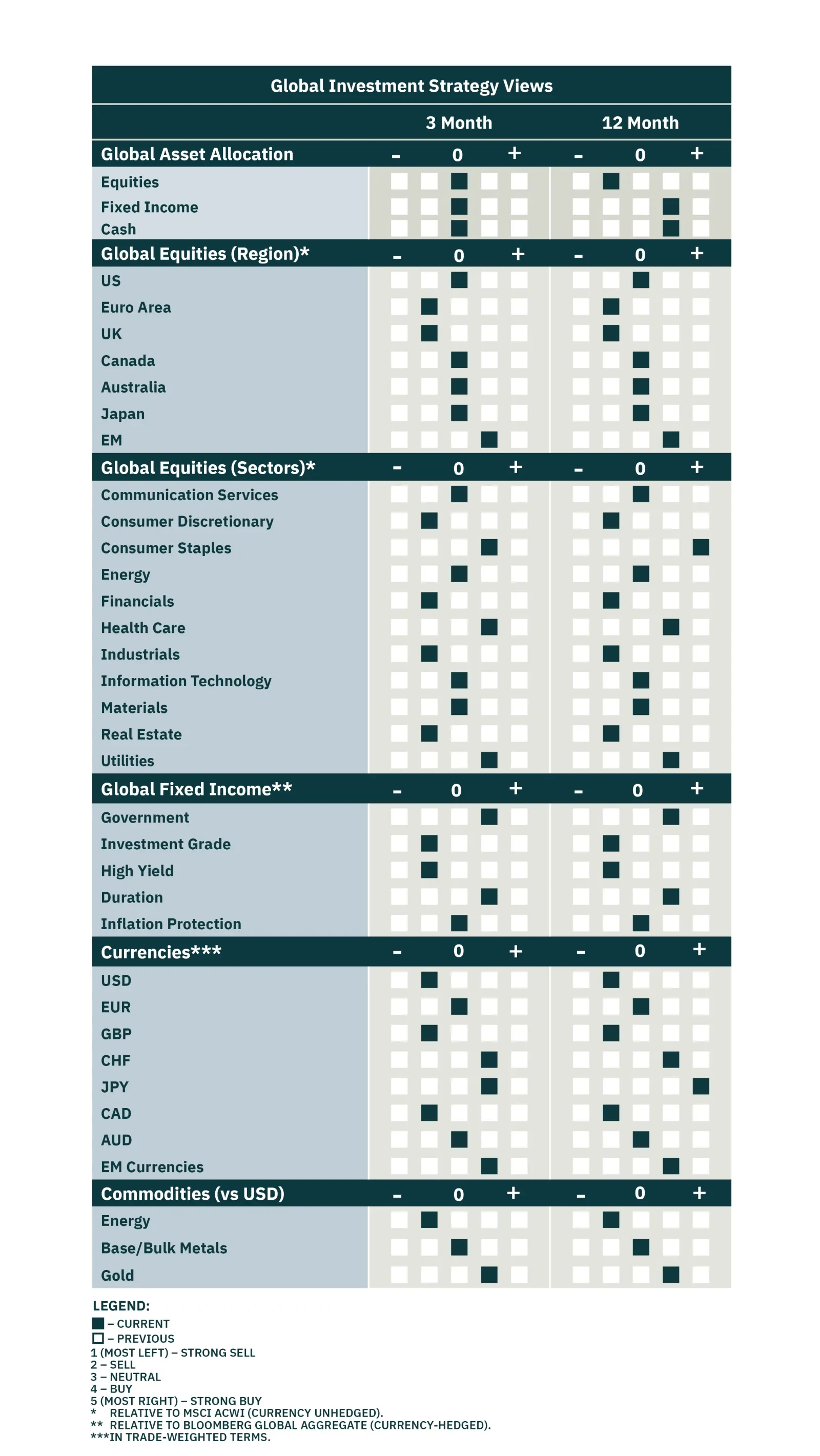 The Global Investment Strategy team (GIS) summarizes its views via a matrix featuring recommendations over a tactical 3 month horizon and a cyclical 12 month horizon. While GIS uses the MacroQuant model as one of several inputs into its decision-making process, the GIS views shown in this matrix may differ from the MacroQuant model's recommendations shown in the dedicated monthly MacroQuant reports.
