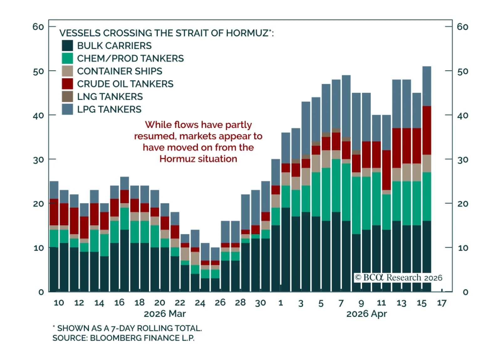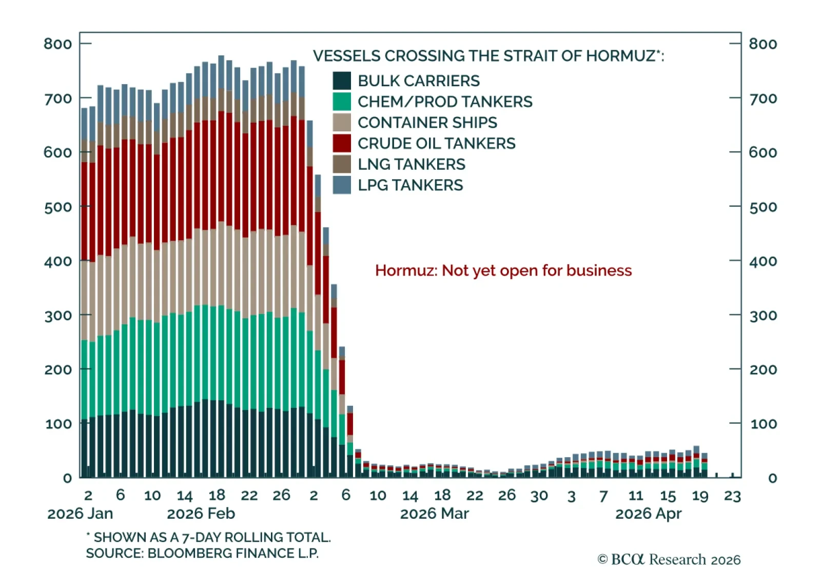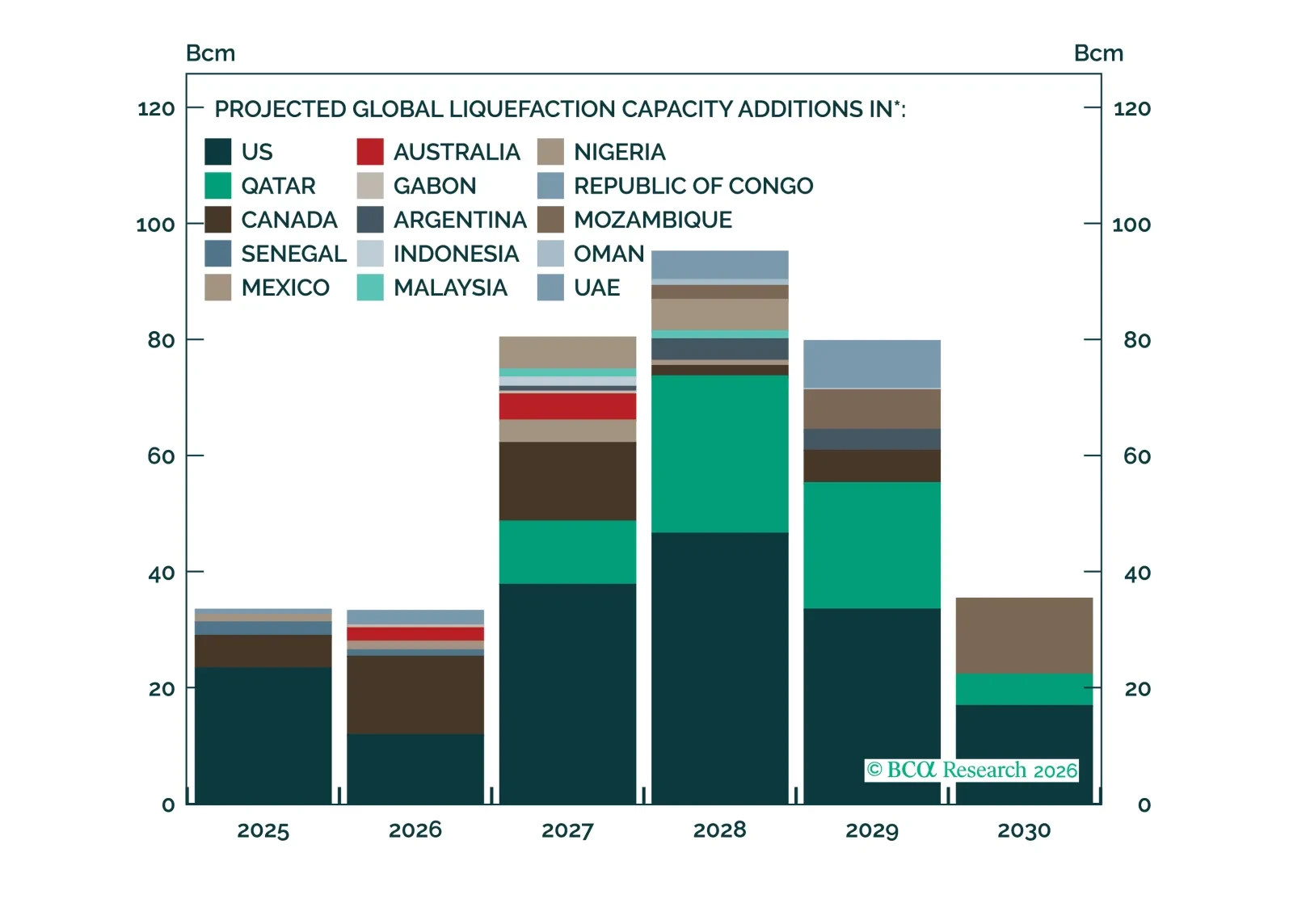 FeatureIn some respects, the Strait of Hormuz disruption is more severe for global LNG markets than for oil. First, although a trickle of oil tankers has exited the Strait since the war began, no laden LNG tankers have left the Persian Gulf (Chart 1). Second, unlike oil, natural gas has no alternative pipeline routes that can be used to bypass the Strait of Hormuz. Third, QatarEnergy’s Ras Laffan LNG facility sustained major damage in an Iranian attack, that will take years to fully restore. Finally, unlike oil, natural gas lacks a mechanism for coordinated global stockpile releases.    Chart 1 No LNG Has Exited The Strait Of Hormuz No LNG Has Exited The Strait Of Hormuz Over the longer term, however, a wave of new LNG export capacity will come online, helping to cushion the impact of Hormuz-related disruptions. In this report, we assess the likely net effect of these forces on LNG markets over both cyclical and structural horizons.Quantifying The 2026 Supply ShortfallIn an optimistic scenario in which the Strait of Hormuz reopens in May, the disruption would reduce global LNG supply by roughly 6% in 2026. Most of that shortfall would be offset by a 5% increase in global LNG liquefaction capacity expected to come online this year. However, if Hormuz remains closed for longer, the disruption to global LNG supplies would considerably worsen.The absence of alternative routes that bypass the Strait of Hormuz and the lack of global emergency gas stockpiles available for a coordinated release mean that the global LNG market has fewer buffers than the oil market to absorb the Hormuz-related supply shock. As a result, the closure of the strait is preventing the full 20% of global LNG trade that normally passes through the chokepoint from reaching the rest of the world. This equates to around 3% of global natural gas consumption being offline.Even if the strait is reopened in May – an optimistic scenario – we estimate that the disruption will lead to a 6% loss of global LNG supply, representing a 1% loss in global natural gas consumption, over 2026. Specifically:By the end of April, around 3% of annual global LNG supply will have already been lost due to the closure of the Strait of Hormuz. As long as the strait remains closed, losses will continue to expand at a monthly rate of 2% of LNG exports.  Even if the Strait is reopened at the start of May, an additional 1% of global annual LNG flows will be lost as Qatar’s Ras Laffan and the UAE’s Das Island gradually restore output.Even though QatarEnergy has started working towards resuming LNG production at its Ras Laffan plants, a full restoration of production at these facilities will take nearly three months. That is because the production ramp-up of the 12 undamaged liquefaction trains will occur in a phased manner. We use a similar ramp-up schedule for the UAE’s liquefaction capacity. True, a reopening of the strait will allow the supplies carried in the 20 loaded LNG tankers currently trapped in the Persian Gulf to become available for global markets. However, these tankers hold only about a week’s worth of pre-war Hormuz exports. Meanwhile, Gulf LNG exporters typically have only a few days’ worth of reserves. So, even if empty tankers were available, they would not be able to immediately ship more supplies.  Around 2% of global LNG supply this year will be lost due to the damage sustained to two of Ras Laffan’s liquefaction trains.It will take at least three years for production at these facilities to be restored. Therefore, even if energy flows through the Strait of Hormuz normalize, these liquefaction trains will remain offline for the remainder of the year.  Moreover, the closure of the UAE’s Shah gas field due to attacks is an added risk to Hormuz LNG exports. While its closure does not directly affect LNG exports, it likely will require the UAE to increase LNG imports – mainly from Qatar.  If this scenario plays out, lost Gulf LNG exports to the world will rise to 8% of global LNG exports. Liquefaction capacity additions in the rest of the world will partially offset the impact of the supply disruption this year. Assuming production at the UAE’s Shah gas field is restored, new global LNG capacity will offset nearly 90% of disrupted supply, especially towards the end of this year. The Structural Supply OutlookGlobal liquefaction capacity additions will significantly ease the 2027 LNG market balance before causing large surpluses from 2028 onwards.When accounting for the Iran war's longer term disruption to global LNG markets, consider the following:It will take three to five years for Qatar Energy to fully restore Ras Laffan’s two damaged liquefaction trains (nearly 3% of global LNG capacity).The UAE may need to rely more on LNG imports from Qatar until production capacity is restored at its damaged Shah gas field. This will delay the full restoration of LNG flows through Hormuz.Planned liquefaction capacity additions in Qatar and the UAE could be delayed. Given the uncertainty about how long it will take to repair damaged infrastructure, we examine the global LNG balance under three supply-side scenarios:1) The optimistic scenario assumes:Production at the first and second damaged trains in Ras Laffan is restored by end-2027 and end-2029, respectively.There is no lingering damage to the Shah gas field. 2) The pessimistic scenario assumes:Production at the first and second damaged trains in Ras Laffan is restored by end-2027 and end-2029, respectively.The UAE will rely more heavily on Qatari LNG into 2027 to offset the loss from the Shah gas field’s outage.  3) The very pessimistic scenario assumes:Production at the first and second damaged trains in Ras Laffan is restored by end-2027 and end-2029, respectively.The UAE will rely more heavily on Qatari LNG into 2027 to offset the loss from the Shah gas field’s outage.Liquefaction capacity additions from Qatar and the UAE are delayed by one