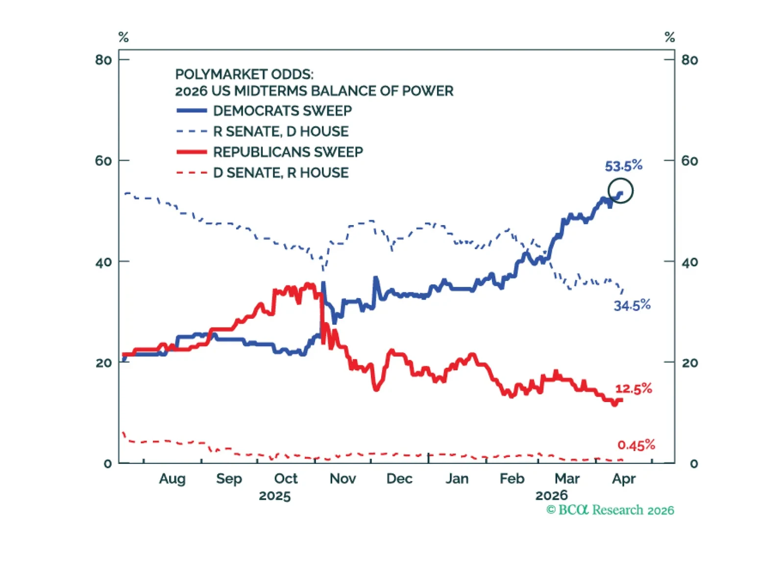 Markets may be underpricing a bifurcated political outcome. Unless the Iran deescalation succeeds, the delayed economic fallout from the energy shock could materially worsen Republican prospects and raise the probability of a Democratic Senate victory.