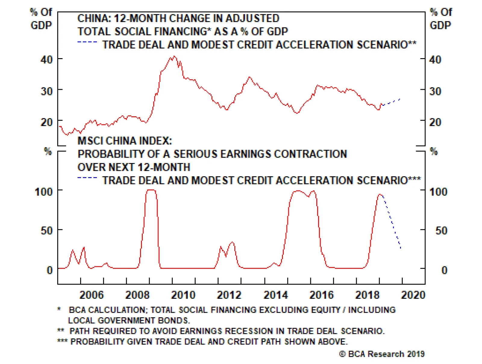 Still, what we now know is that Xi Jinping and his top economic adviser, Vice Premier Liu He, are not initiating the “assault phase of reform” that their predecessors initiated in the late 1990s in order to cleanse China’s economy of bad loans and zombie companies. Instead, they are likely reestablishing the “Socialist Put” in order to reverse the current deceleration, demonstrate China’s continued economic might and face down the United States’ threat of tariffs. Bottom Line: China’s stimulus measures are increasingly likely to overshoot, with positive implications for both Chinese and global growth. China is still facing a corporate earnings recession, but the odds of averting it are increasing. Trade Deadline More Likely To Be Extended What of the trade war? First, we would warn clients that China’s annual credit origination is a much bigger factor for the global economy than China’s exports to the United States (Chart 5). The trade war can escalate from here and yet, if China’s stimulus works as it has in the past, the results will be manageable for China’s economy save for Chinese companies expressly exposed to the U.S. economy through exports. In reality, both the U.S. and China are now effectively stimulating their economies and in this sense global trade as a whole will benefit regardless of bilateral tariffs. Chart 5Watch China Credit, Not So Much The Trade War