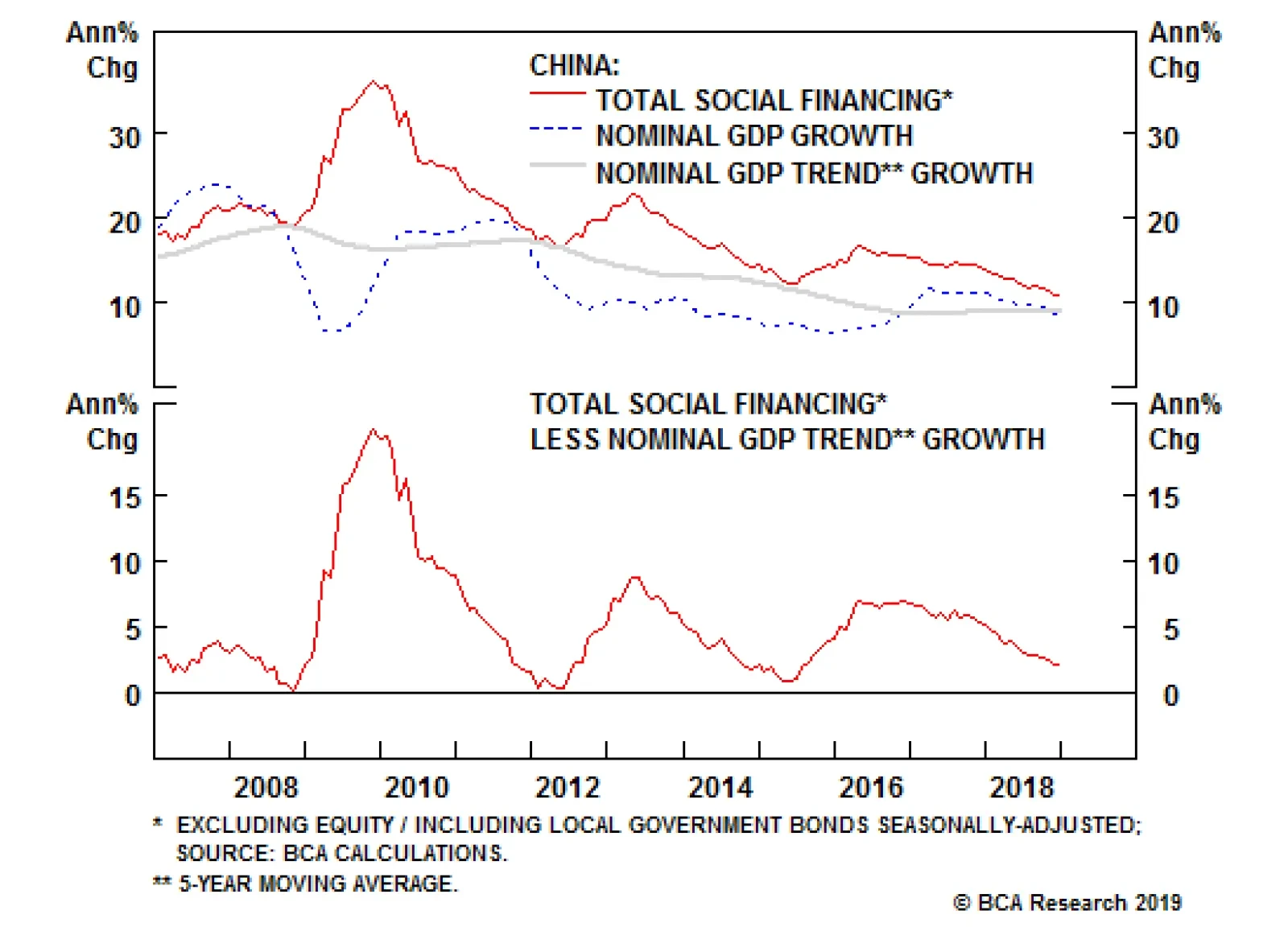 Recent tax changes, including an increase in the threshold at which income begins to be taxed and an expansion of deductions for childhood education, medical costs, and home loan interest and rent, are steps in the right direction. More Financial Repression? Over a longer-term horizon, the Chinese authorities are also likely to step up efforts to discourage savings by driving down real interest rates into negative territory. Since nominal interest rates are already low in China, the only way to reduce real rates is to raise inflation. The added benefit of higher inflation is that it would boost nominal GDP growth, thus putting downward pressure on the debt-to-GDP ratio. The catch is that negative real rates could destabilize the currency, fueling capital outflows. Negative real rates could also inflate asset bubbles, especially in the property market. The only way to square the circle is to tighten administrative controls, such as those relating to property speculation and capital flows, in order to preserve the benefits of negative real rates, while attenuating the costs. This suggests that hopes that the RMB will become an international reserve currency anytime soon are likely to be dashed. China Will Continue To Back Off From Its Deleveraging Campaign Realistically, the measures to boost consumption listed above will take time to implement. In the meantime, China’s economy continues to slow. Not only does a weaker economy endanger domestic stability, it also puts the Chinese government in a weaker negotiating position with the Trump administration over trade matters. This suggests that the government will continue to ease off its deleveraging campaign at least until growth recovers. Granted, one could have said the same thing last year. That is correct, but here is the thing: last year, credit growth was running at a much faster pace than today. Total social financing increased by only 11% year-over-year in December, not much higher than trend nominal GDP growth. On all three occasions over the past ten years when credit growth has fallen back towards nominal GDP growth, the government has allowed credit growth to accelerate (Chart 13). Chart 13China: Credit Growth Versus GDP Growth
