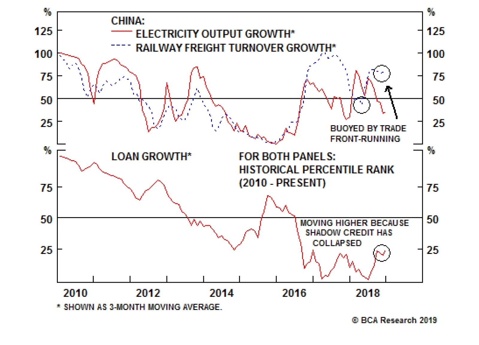 With high conviction, our answer to this question is no. Panel 1 of above chart shows the percentile rank of the two most cyclical components of the LKI. From 2010 to early-2018, electricity production and railway freight volume moved closely together, with…