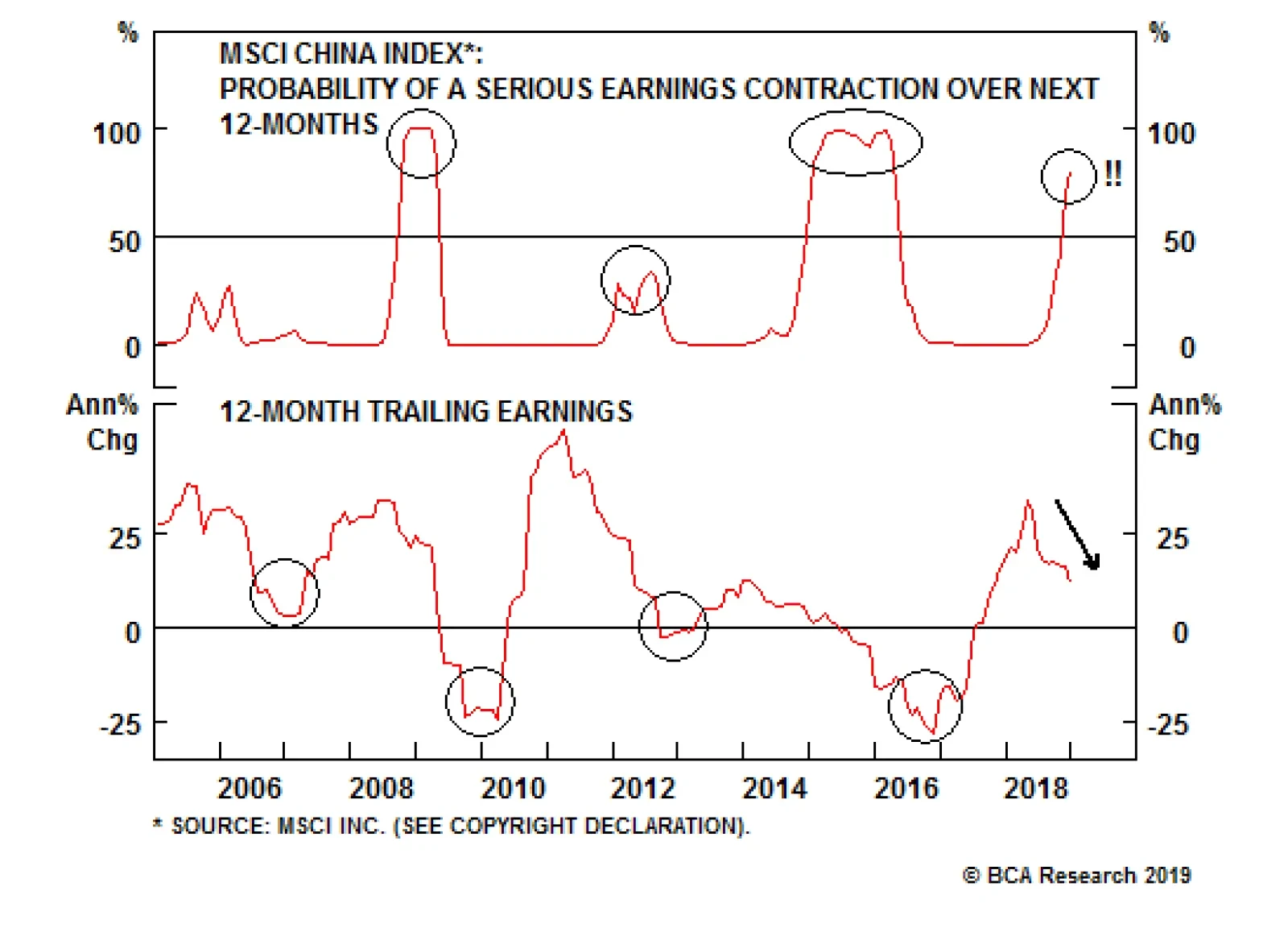 Highlights Our market-based China growth indicator has risen meaningfully since mid-December, but mostly due to the equity components. For now, we regard this as a mixed signal, rather than a green light for Chinese stocks. Our research suggests that the odds of a serious earnings contraction for Chinese investable stocks over the coming year are high. Stocks are only likely to bottom near the end of the earnings adjustment process, if the 2014-2015 episode is a guide. Despite reasonable relative valuation, the long-term downtrend in sales-to-GDP suggests that Chinese stocks may be a “value trap” even over a multi-year time horizon. Feature Over the past several months BCA’s China Investment Strategy service has focused heavily on the cyclical condition of China’s economy, and whether any “green shoots” are evident from the key indicators that we track. We noted in last week’s report that our leading indicator for China’s old economy continues to point to slower growth over the coming months,1 a conclusion that is generally supported by the December trade, money, and credit data. In today's special report we address six questions concerning the outlook for Chinese stocks in light of passive outperformance versus the global benchmark over the past 3 months. We highlighted in last week’s report that investors should not view recent outperformance as a positive cyclical sign for Chinese stocks, and our answers to the questions below will hopefully provide readers with a fuller understanding of our neutral stance over a 6- to 12-month time horizon. The bottom line of our analysis is that a cyclical (6-12 month) overweight stance toward Chinese investable stocks versus the global benchmark remains uncompelling until the earnings contraction that is likely to occur this year is well underway. Chinese stocks offer reasonable-to-good valuation relative to global stocks, but may be cheap for a reason even over a multi-year time horizon. We remain tactically overweight Chinese investable stocks in recognition of the fact that investors may bid up the market in the lead-up to a possible trade deal with the U.S., but a legitimate improvement in domestic fundamentals is likely needed before we recommend investors upgrade their medium-term equity allocation to China. Q: Are the market signals from China-related assets bullish or bearish for Chinese stocks? A: Our market-based China growth indicator has risen meaningfully since mid-December, but mostly due to the equity components. For now, we regard this as a mixed signal, rather than a green light for Chinese stocks. Chart 1 presents our market-based China growth indicator, its four asset class subcomponents, and the range between the strongest and weakest components. Table 1 shows the change in the indicator and its 17 individual components since December 10, when the indicator clearly broke out. Chart 1Largely Driven By EM Equity Relative Performance