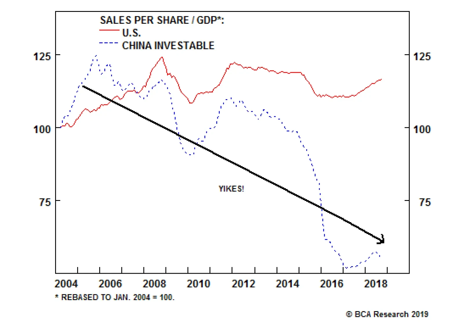 Excessive Chinese stock market valuation at the end of the last economic cycle has certainly contributed to the divergence shown in Chart 9. But Chart 10 shows another, less discussed factor: Chinese fundamental performance has not kept up with GDP growth, in contrast to developed markets. The chart shows the indexed ratio of sales per share to nominal GDP growth for the U.S. and China, and highlights that the latter has not only trended downward over time but has collapsed over the past four years. Chart 10Are Chinese Stocks Really A Play On Higher Chinese Growth?