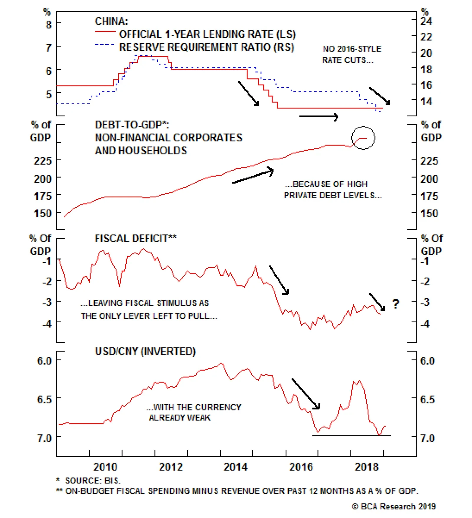 Policymakers will likely be forced into action again in 2019 if nominal GDP growth, which hit 9.6% in the third quarter of 2018, falls back below 7.5%. Forward-looking economic measures like our Li Keqiang leading indicator and the export orders component of China’s manufacturing PMI suggest that weaker growth outcome could occur by mid-2019. China’s policymakers are likely to announce some form of stimulus in the first half of the year help counteract the growth slump, which could help boost global investor confidence (especially if it is accompanied by a new trade agreement with the U.S.). While Chinese policymakers are now under more pressure to provide stimulus measures, the tools available to them are more limited than was the case in 2015/16 (Chart 7). Interest rate cuts could happen if growth continues to fall more rapidly than expected, but that would create a burst in private sector leverage that policymakers would seek to avoid. The currency could also be weakened further, but the USD/CNY exchange rate is already back to near the 7.0 level reached in the 2016 devaluation. Chart 7...Atlhough Policy Options Are More Limited Than 2016