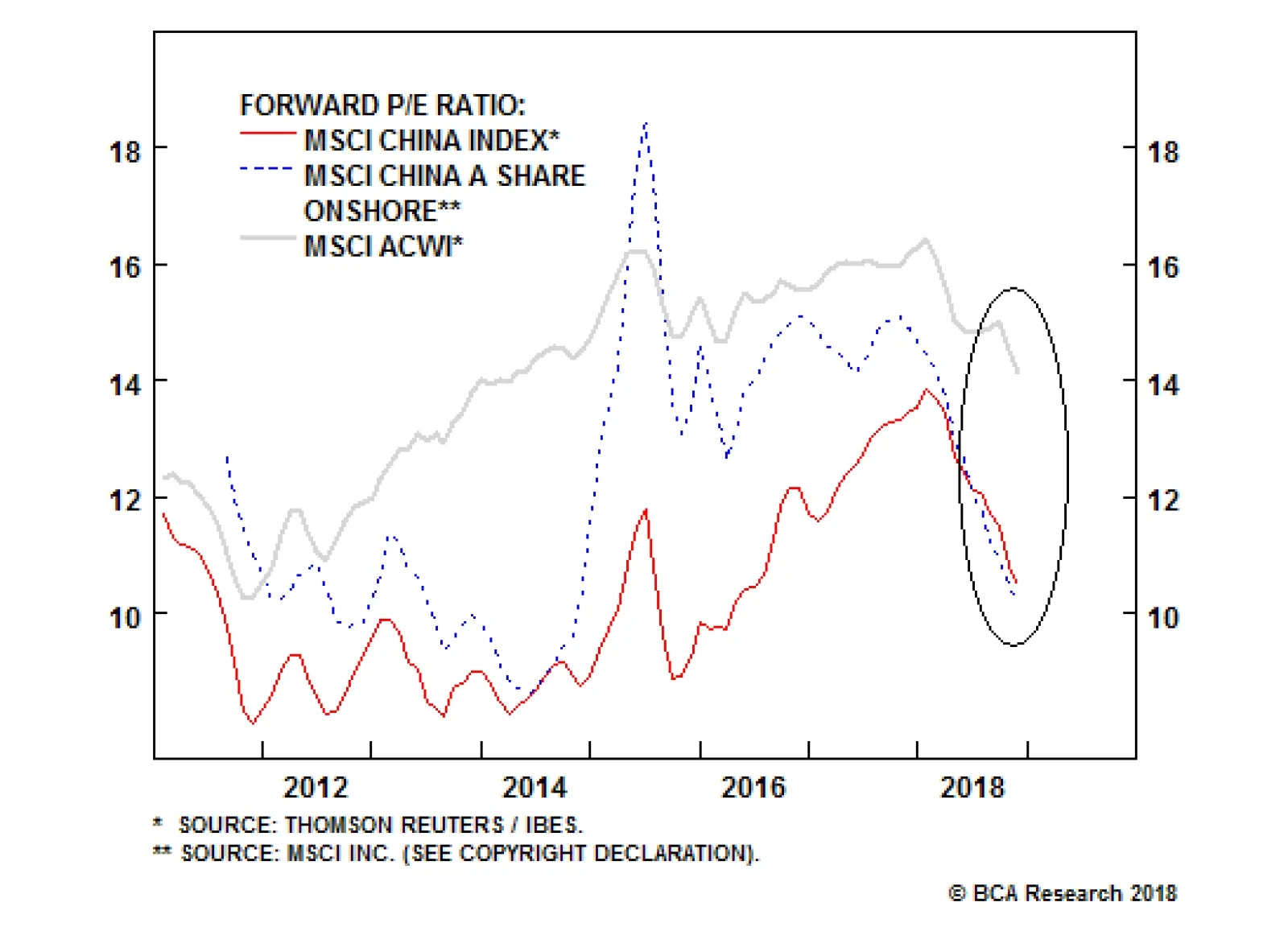 This is a valid line of inquiry. Over a 6-12 month time horizon, valuation rarely drives asset returns, and we recently argued against the view that valuation could act as an overwhelming rally catalyst for Chinese stocks in 2019. However, we agree that valuation should be increasingly considered as one’s time horizon expands. Chart 13 shows that valuation has been a powerful predictor of 10-year future performance for the U.S. equity market, and Chart 14 shows that the forward P/E ratio for both domestic and investable Chinese stocks has certainly improved over the past several months. In relative terms, Chinese stocks are not as cheap as they have ever been, but haven’t usually been cheaper (at least over the past decade). This is particularly true for the A-share market (Chart 15). Chart 14Chinese Stocks Are Now Considerably Cheaper Than A Year Ago...