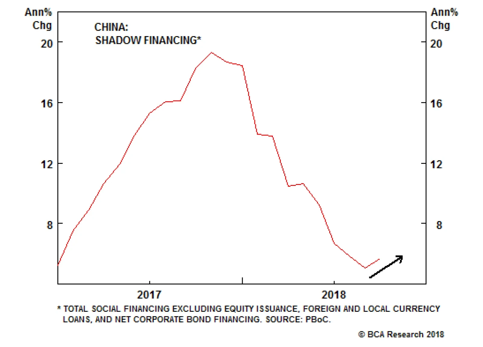 Highlights Economic data and policy announcements over the past month reflect the view that policymakers are serious about restraining credit growth, and that they will attempt to combat any weakness in external demand by boosting domestic consumption. A review of historical episodes of "outsized" investment intensity shows that policymakers have good reason to try and shift the composition of China's economy towards consumption, as it suggests that China's current experience probably cannot be sustained. A shift even somewhat away from heavy investment-led growth means that the "strike price" of the China put option has fallen relative to past economic slowdowns, implying that it will take more pain before investors can cash in. It is too soon to move towards an outright long position favoring domestic stocks, even though considerable bad news has been priced in. CNY-USD likely has further downside, and investors allocating among Chinese stocks should only favor domestic over investable equities in currency-hedged terms. Feature September's total social financing data, released earlier this month, provided important evidence supporting our view that Chinese policymakers are not aiming for a significant acceleration in private sector credit growth. Chart 1 highlights that the year-over-year growth rate of adjusted total social financing (TSF) actually ticked modestly lower in September, in clear contrast to the bet of many investors that China is following its "old stimulus rulebook". Chart 1Chinese Policymakers Are Not Pumping The Credit Taps