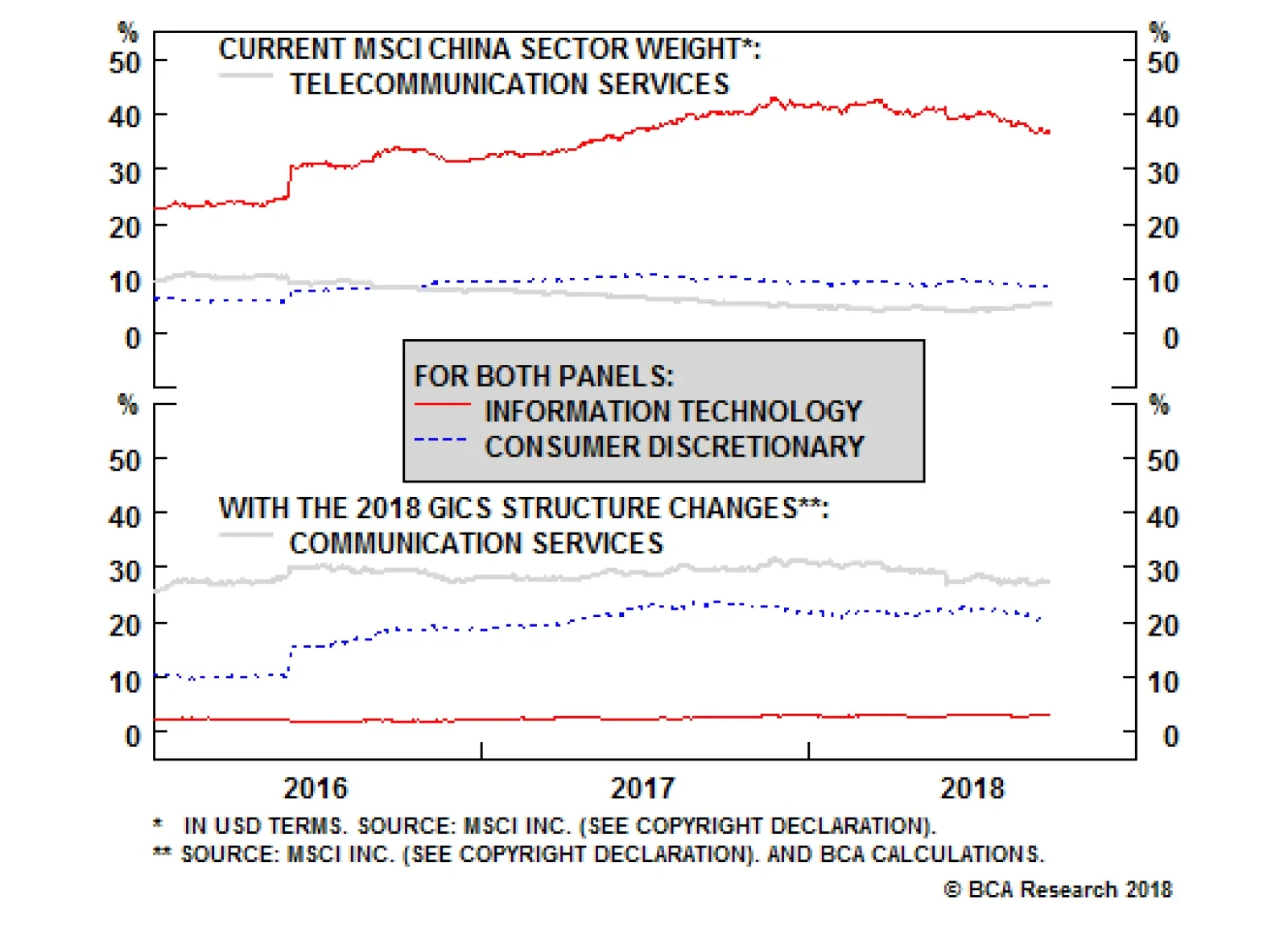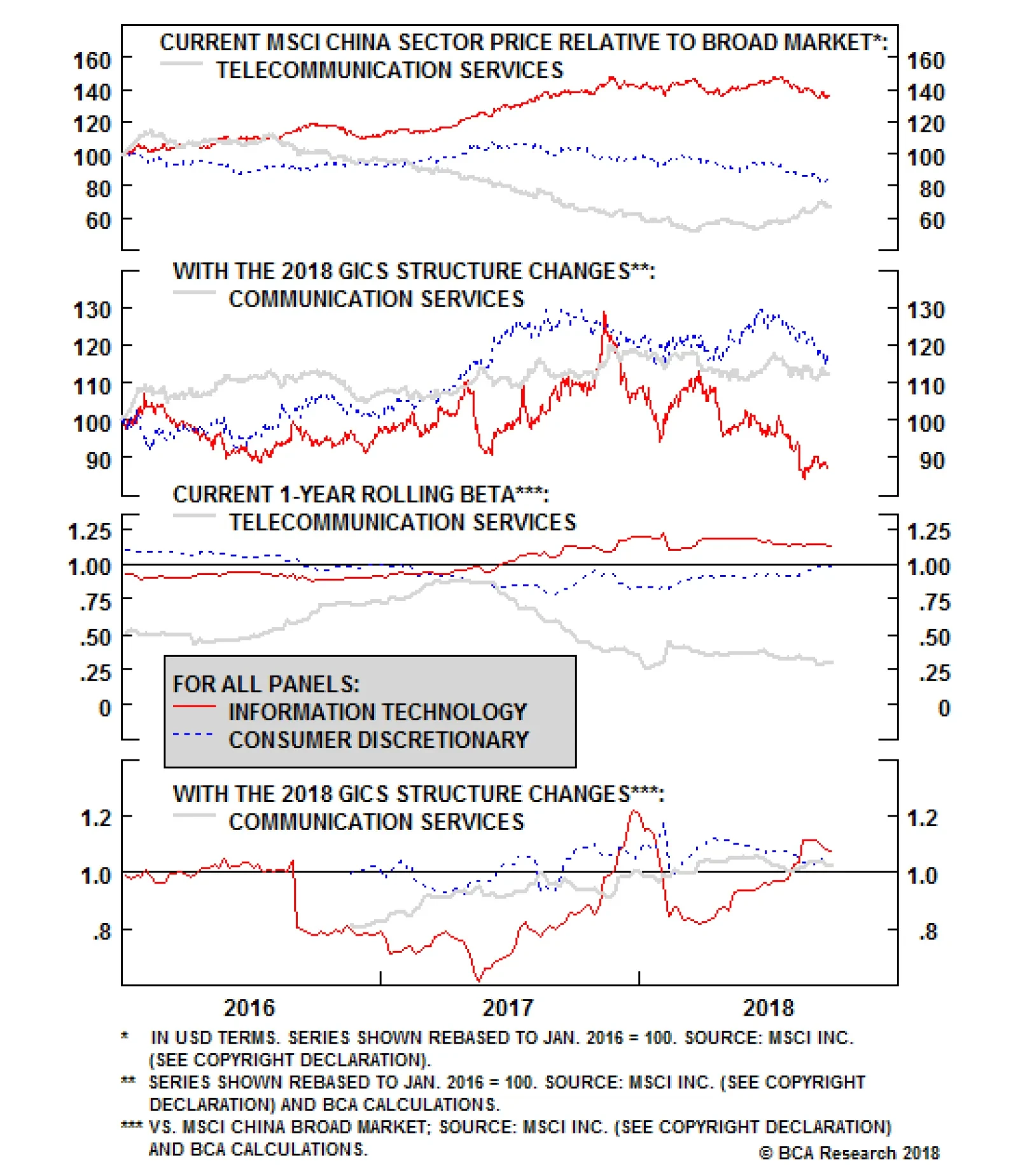 Highlights The upcoming changes to the Global Industry Classification Standard will substantially alter the sector composition of the MSCI China Investable index, by hollowing out the information technology sector (to the benefit of consumer discretionary and the new communication services sector). The new communication services sector will become a market-neutral (but barbelled) sector from the perspective of cyclicality, with high- and low-beta components. The inclusion of Alibaba in the consumer discretionary sector warrants the closure of our most successful trade over the past year: long consumer staples / short discretionary. Feature S&P Dow Jones and MSCI Inc. will be implementing major structural changes to the Global Industry Classification Standard (GICS), effective after the market close on September 28, 2018. The changes are among the most significant since the GICS was launched in 1999, and there are meaningful implications for investors. In this brief special report, we summarize the key changes as they pertain to the Chinese investable equity benchmark, and provide a counterfactual simulation of historical performance had the upcoming changes been in effect over the past three years.1 For the MSCI China index, the main investable equity benchmark, the changes to the GICS structure will largely impact three sectors: information technology, consumer discretionary, and telecommunication services: The telecommunication services sector will be renamed to "communication services", and this new level 1 sector will be much broader in scope. Communication services will include companies that facilitate transformation in the way of communication, entertainment, and information seeking. In addition to the companies currently classified within telecommunication services, communication services will include media stocks formerly in the consumer discretionary sector, including advertising, broadcasting, cable & satellite, publishing, movies & entertainment sub-sectors. In addition, home entertainment software and some internet software & services companies, currently classified under the information technology sector, will also move to communication services. These include prominent stocks like Baidu, Tencent, Sina, and Sohu. The consumer discretionary sector will include online retailers, such as Alibaba, from information technology sector under its internet & direct marketing retail sub-sector. Chart 1 shows that these changes will have a very substantial impact on the sector composition of the MSCI China index. The weight of the information technology sector will drop dramatically from 37% to 3% after the GICS changes occur, because all three of the BAT stocks (Baidu, Alibaba, and Tencent) will move to other sectors. The weight of consumer discretionary is set to rise from 8% to 20%, as the inclusion of Alibaba offsets the removal of media (Alibaba alone will account for 60% of the consumer discretionary sector after the GICS changes). Relative to the current weight of telecommunication services, the new communication services sector weight will be substantially higher, at 27% (versus its 5% current weight). Chart 2 provides both factual and counterfactual perspectives on what relative performance for these three sectors would have looked like since 2016, had the upcoming changes been in effect. The chart shows that the relative performance of consumer discretionary and communication services sector would have been considerably stronger, while the tech sector would have underperformed (in sharp contrast to what has actually occurred). Chart 3 provides some perspective on the cyclicality of China's new communication services sector. The telecommunication services sector is clearly a defensive sector, and has exhibited a beta less than 0.5 over the past year. However, the chart shows that communication services (had it existed), would have basically been a market-neutral sector in terms of market beta because of the offsetting impact of both including high-beta internet software & services companies and low-beta telecommunication services. In effect, the new communication services will become a barbelled sector from the perspective of cyclicality, with high- and low-beta components. Chart 1A Hollowing Out Of The Information Technology Sector