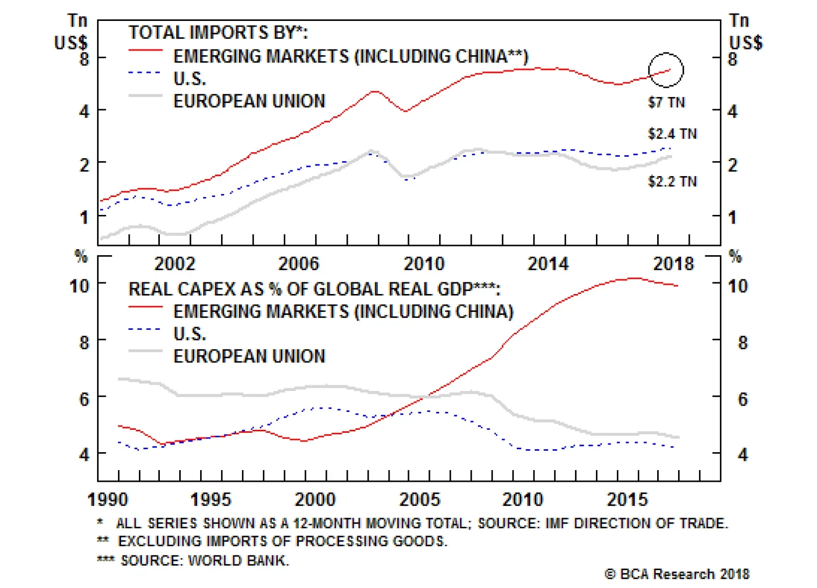 Aggregate investment expenditures in developing countries including China are as large as those of the U.S. and EU together. China itself accounts for half of EM investment expenditures. Chinese imports are much more leveraged to the country’s capital…