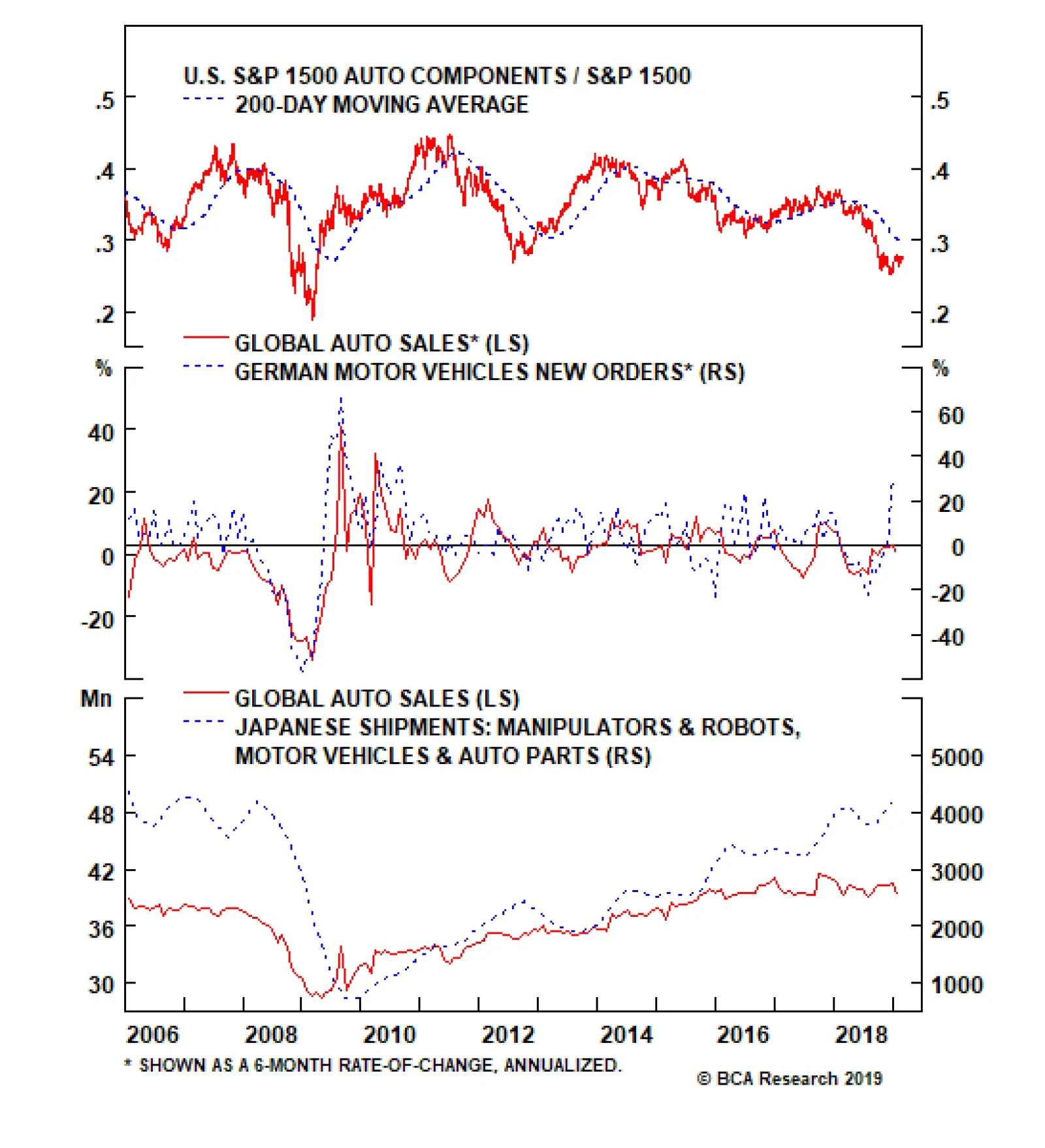 Both autos and automotive components stocks have been underperforming, the former since 2013 and the latter quite dramatically since the beginning of 2018 (top panel). This in spite of light vehicle sales stuck at persistently elevated…