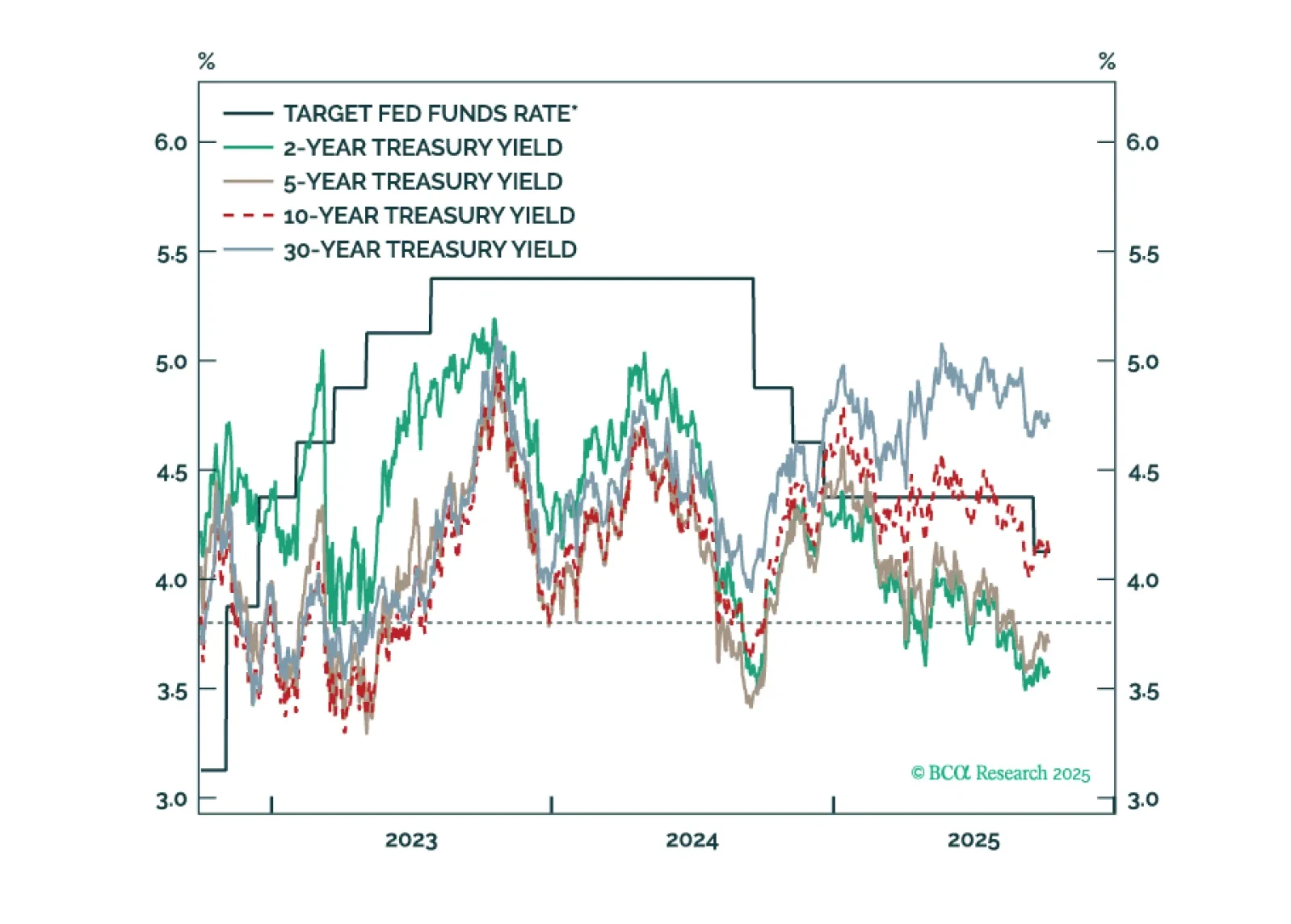 Treasury yields are generally following the pattern of past interest rate cycles, but with a larger term premium keeping the curve steeper than usual.
