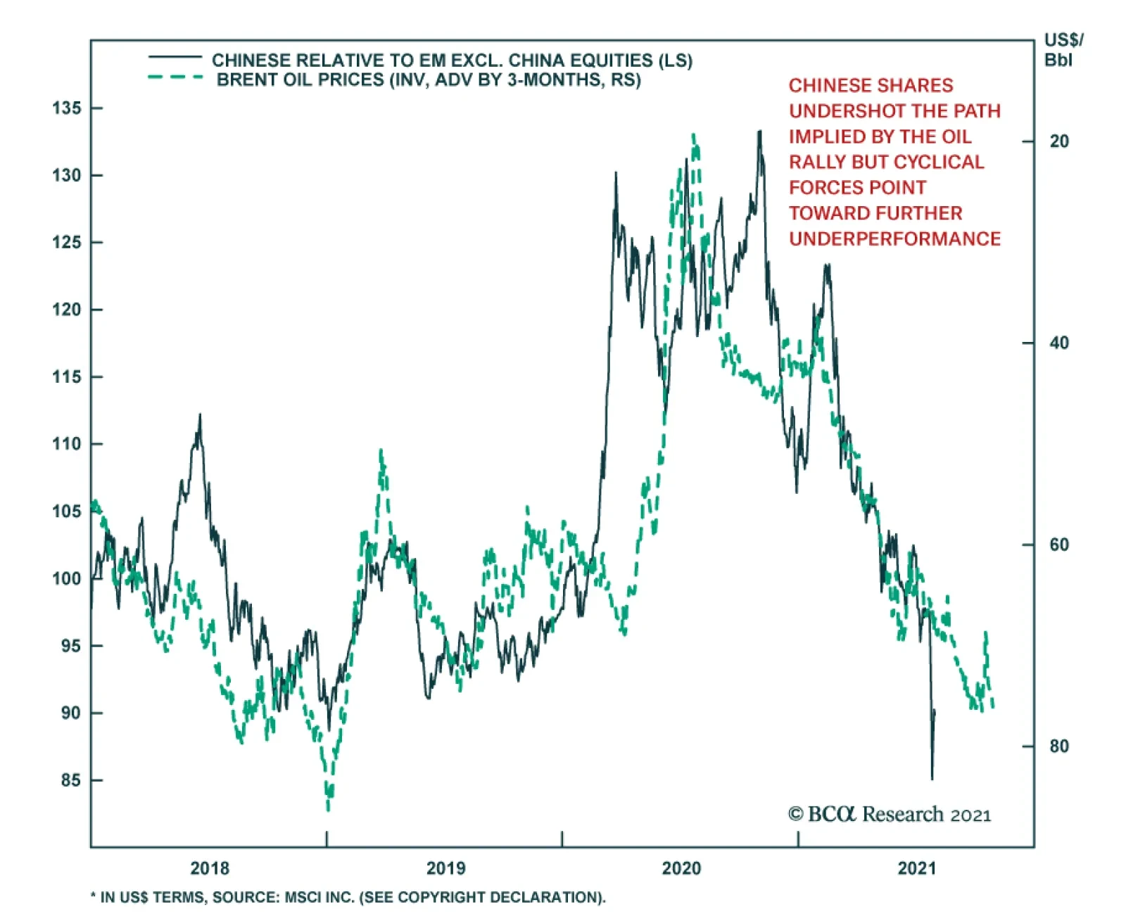 China is a large net importer of oil and rising crude prices act as a significant drag on this economy, at least compared to other emerging markets. Consequently, the relative performance of Chinese equities has tracked with a…