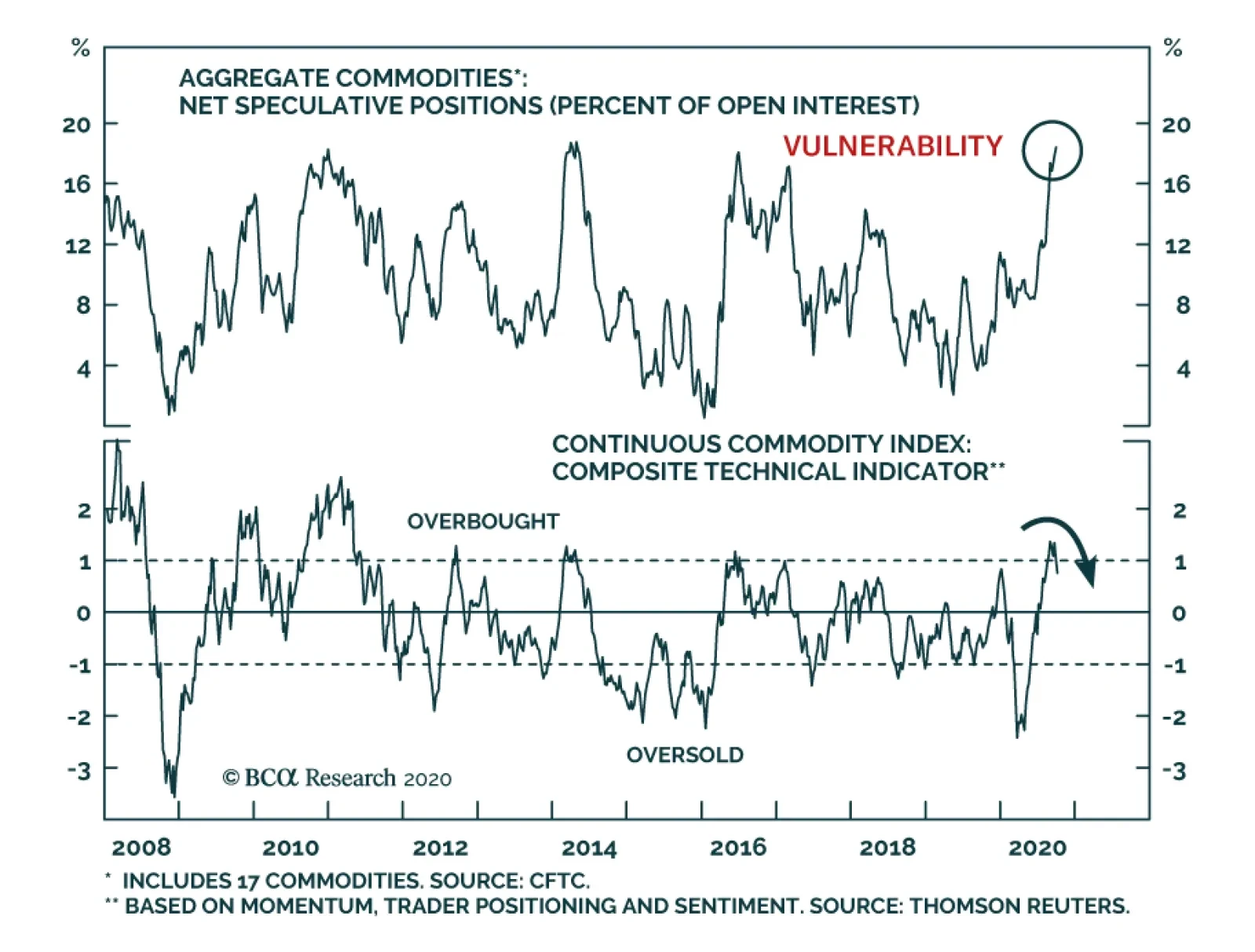 US inflation expectations have risen meaningfully, and US TIPS (real) yields have plummeted since April (Chart I-1). Consistent with plunging US real rates, the US dollar has sold off sharply (Chart I-1, bottom panel). Although our bias is that US inflation will rise in the coming years, for now, the rise in inflation expectations seems excessive. Given the tight correlation between oil prices and US breakeven inflation, as illustrated in the top panel of Chart I-1, lower crude prices will cause a drop in inflation expectations. Moreover, the absence of another large US fiscal stimulus will also lead to a downgrade in growth and inflation expectations. US nominal bond yields will likely remain largely range bound, and a drop in breakeven inflation will lead to higher real yields. The latter will help the US dollar to rebound from oversold levels, and EM currencies will depreciate against the dollar. In turn, a rebound in the greenback will be associated with lower commodities prices. Notably, investors’ net long positions in copper have become very elevated (Chart I-2). Investor sentiment on commodities in general is quite positive. Hence, from a contrarian perspective, commodities prices are primed for a pullback. In addition, Chinese imports of commodities will slow in the near term, reinforcing the correction in resources prices. China has evidently been stockpiling commodities, as its commodities imports have been considerably stronger than its underlying final demand. In particular, Chart I-3 demonstrates that mainland imports of copper, crude oil, steel and iron ore have been surging. Chinese imports of crude and industrial metals are likely to drop temporarily. Chart I-2Long Copper Is A Crowded Trade