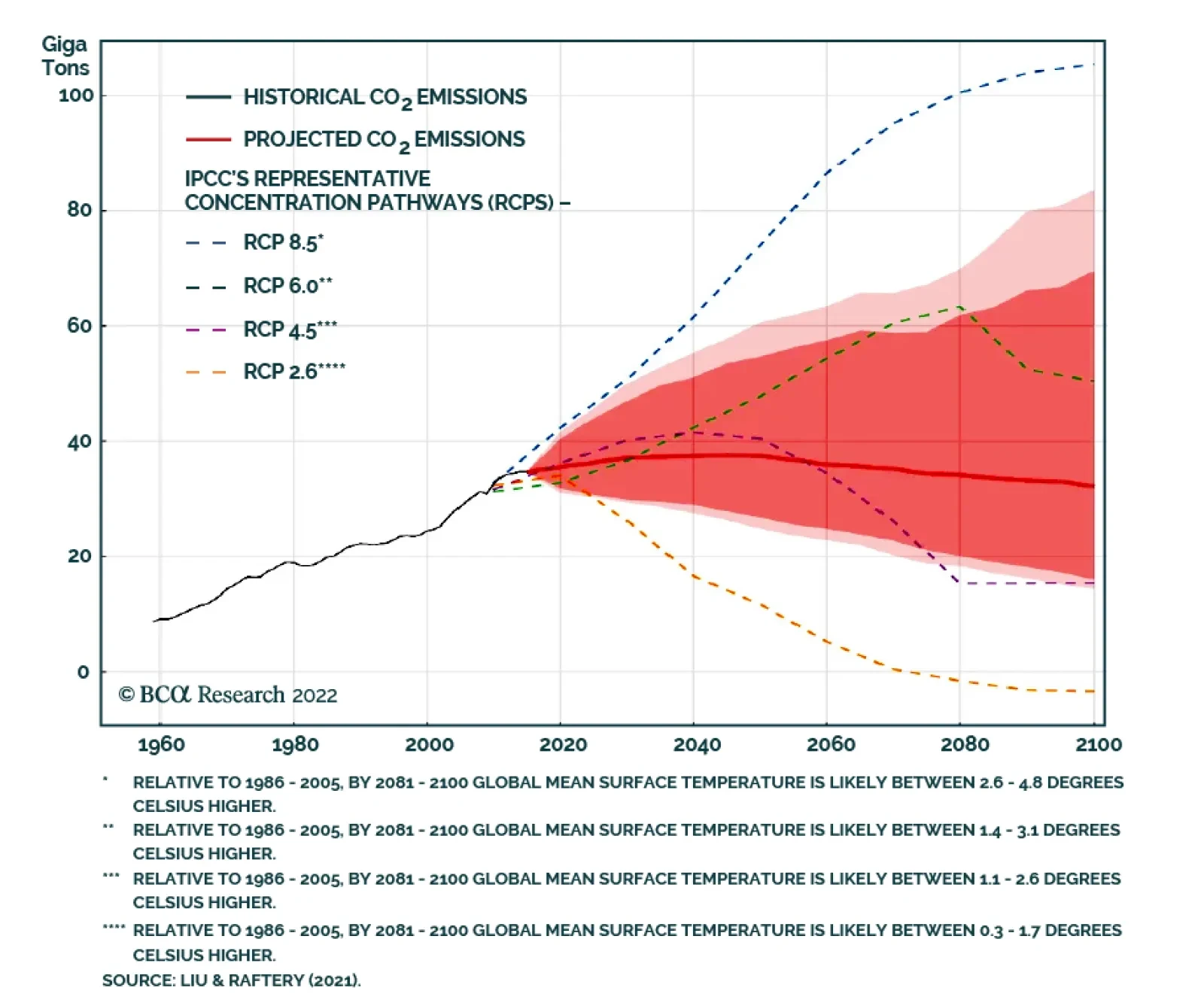 Recent research on global CO2 emissions growth for different countries based on historical values for population, GDP per capita and carbon intensity (measured as CO2 emissions per unit of GDP) projects median annual CO2 emissions in 2100 will be 34 Gigatons (Chart 4).3 This is significantly higher than the emissions required to keep temperature increases under 2° C by the end of the forecast period. The forecast is accompanied by four other CO2 emission scenarios provided by the Intergovernmental Panel on Climate Change (IPCC). Chart 4CO2 Projected Increases Overshoot Paris Agreement Targets