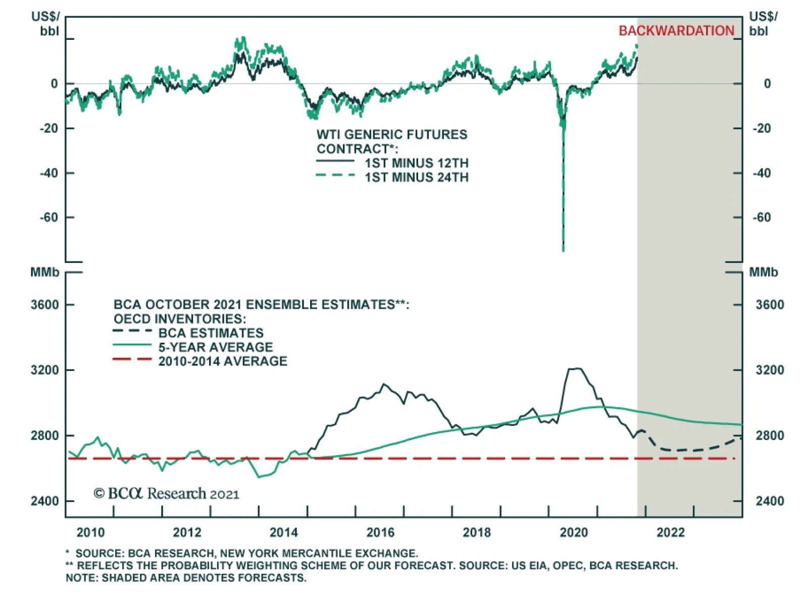 Any policy contemplating a global buildout of renewable-energy generation and its supporting grids, along with EVs and their supporting infrastructure, should start with the recognition laws, regulations and rules need to encourage responsible, safe and sound incentives for developing the supply side of base metals markets. An argument also could be made for fossil-fuels, which arguably should receive technology subsidies and favorable tax treatment – not unlike those granted to renewables and EVs – to invest in carbon-capture tech development. Rules and regulations favoring long-term contracts so that producers are able to address stranded-asset concerns and secure funding for these projects also should be developed. Investment Implications Absent a more thought-out and focused effort to write laws, develop rules and regulations on at least the level of trading blocs, the evolution to a low-carbon energy future will be halting and volatile. This in an of itself is detrimental to funding such an enormous undertaking. Until something like it comes along, we remain long commodity-index exposure – the S&P GSCI index and the COMT ETF – and long the PICK ETF. At tonight's close we are opening a resting order to buy the XME ETF if if trades to or below $40/share. Robert P. Ryan Chief Commodity & Energy Strategist rryan@bcaresearch.com Ashwin Shyam Research Associate Commodity & Energy Strategy ashwin.shyam@bcaresearch.com Paula Struk Research Associate Commodity & Energy Strategy paula.struk@bcaresearch.com Commodities Round-Up Energy: Bullish Crude oil markets unexpectedly moved lower mid-week on the back of yet another drop in Cushing, OK, inventory levels reported by the US EIA. Cushing crude-oil stocks stood at 27.3mm barrels vs. 31.2mm barrels for the week ended 22 October 2021. Two years ago, Cushing inventories were at 46mm barrels. Markets had been rallying on falling Cushing storage levels over the past couple of weeks. The EIA's estimate of refined-product demand – known as "Product Supplied" – remains below comparable 2019 levels at this time of year, although not by much (19.8mm b/d vs. 21.6mm b/d). We expect global oil and liquids demand to rebound above 100mm b/d in the current quarter. Stronger demand in 2022 and 2023 prompted us to raise our Brent forecasts to $80/bbl and $81/bbl, respectively (Chart 7). Base Metals: Bullish Copper continues to trade lower as markets price in a higher likelihood of softer demand for the bellwether metal as the global power-supply crunch weighs on manufacturing activity, particularly in China. Copper inventories are still at precariously low levels, with the red metal in global inventories hitting lows not seen since 2008 (Chart 8). This will keep copper's forward curve backwardated over time, as inventories are drawn to fill the gap between supply and demand globally. Low inventory levels are expected to persist as power rationing in China, which was responsible for more than 41% of global refined copper output in 2020, persists. Precious Metals: Bullish Federal Reserve Chairman Jerome Powell's remarks stating supply disruptions are expected to keep US inflation elevated next year are supportive to base metals. Higher inflation will increase demand for the yellow metal, as investors look for a hedge against USD debasement. However, the Fed's asset-purchase taper, which we expect to be announced in November, and the interest rate hikes we expect as a result of it beginning in end-2022, will push bond yields higher and raise the opportunity cost of holding non-yielding gold. That said, we believe the Fed will remain behind the inflation curve and will work to keep real rates weak, which will tend to support gold prices. Chart 7