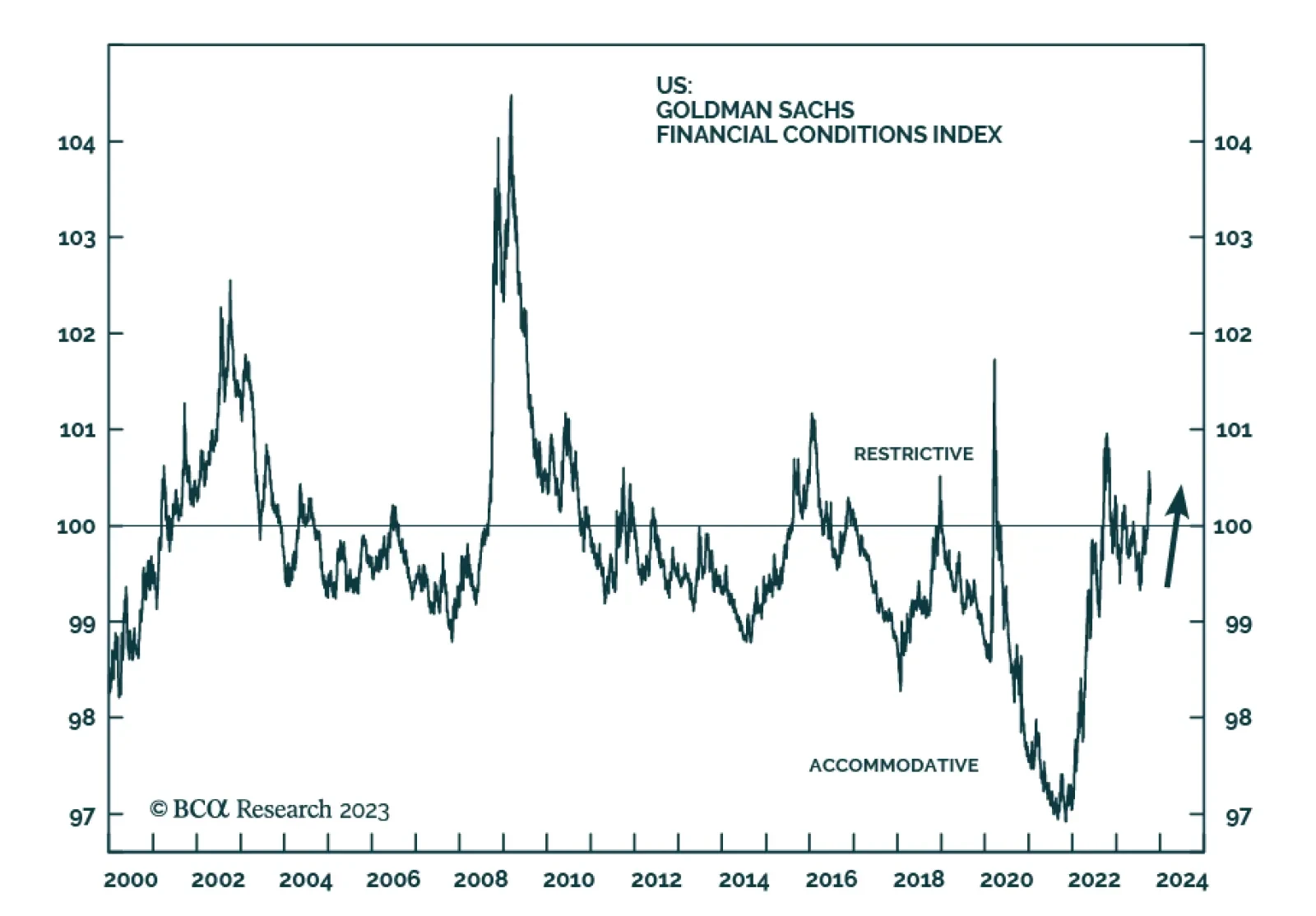 US financial conditions have tightened meaningfully in Q3. While the Goldman Sachs index remains below where it was a year ago, it crossed above the 100 line in late September into restrictive levels after spending most of the…