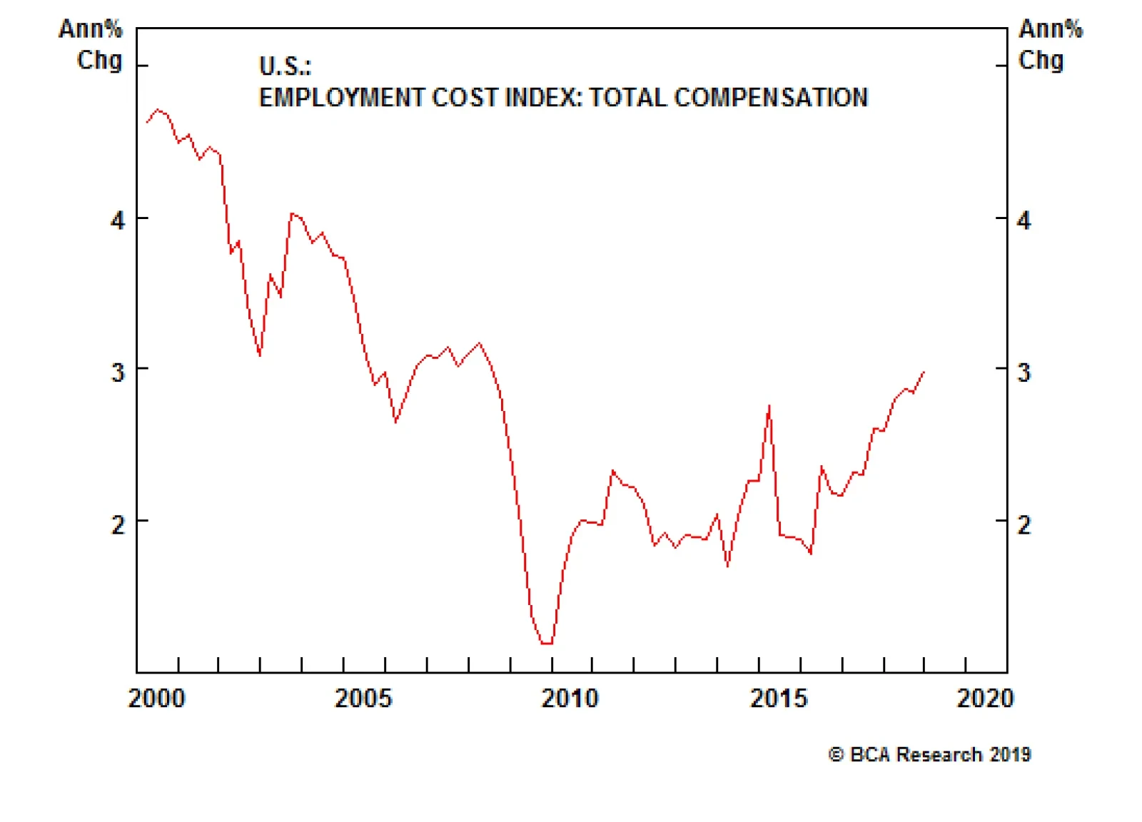 Compensation costs should not hurt margins if they grow at or below the sum of the rate of price-level and productivity gains. If inflation grows at the Fed’s 2% target, and productivity maintains its rough 1.25% growth…