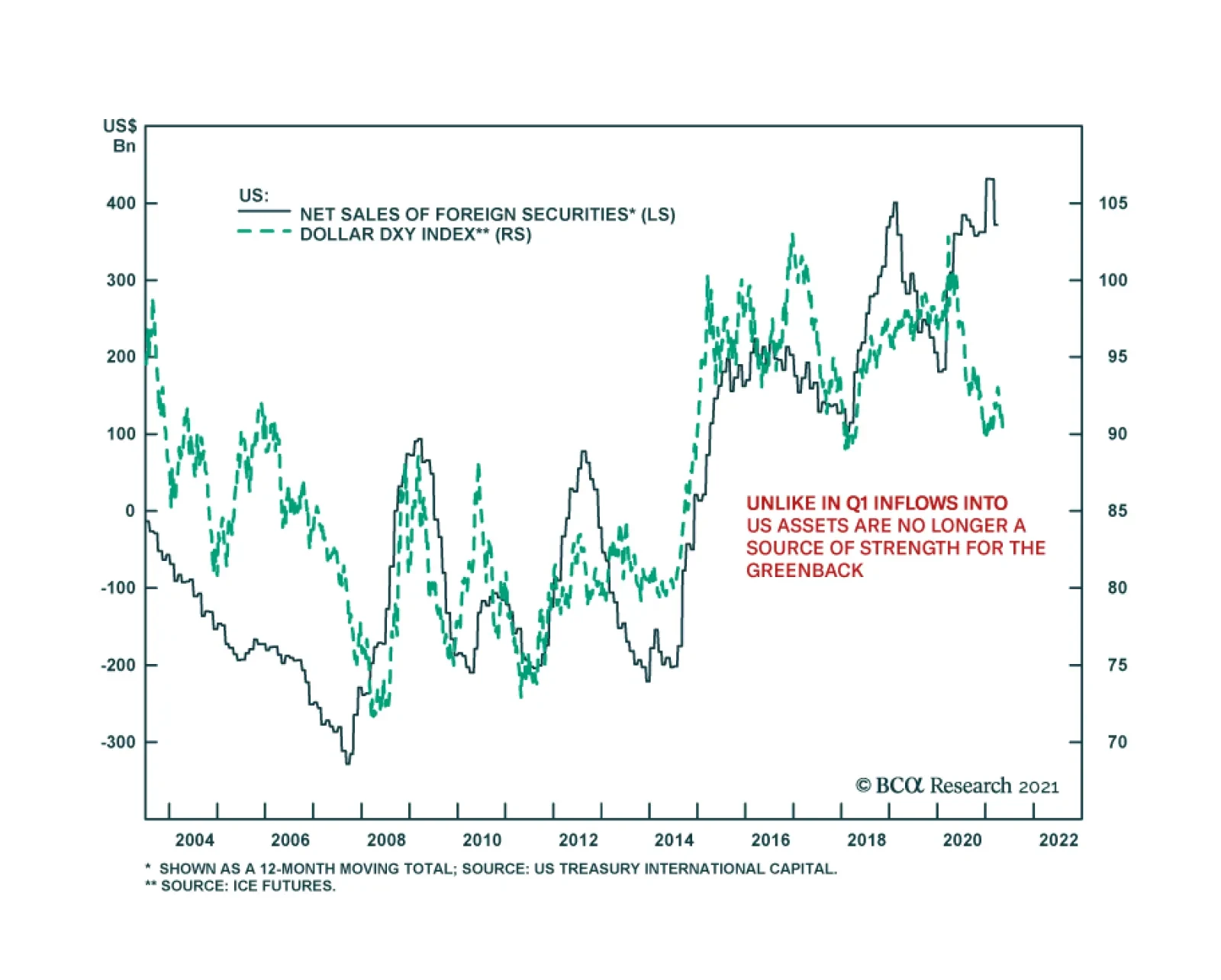 Dear client, In addition to this weekly report, we also sent you a Special Report on cryptocurrencies, authored by my colleagues Guy Russell and Matt Gertken. The conclusion is that government authorities are likely to lean against the proliferation of cryptocurrencies, something we suspected in our most recent report on the topic. Regards, Chester Highlights Net foreign inflows into US assets probably peaked in March. Meanwhile, there are strong reasons to believe outflows from US securities will accelerate in the coming months. As such, the 12-18-month outlook for the US dollar remains negative. Cryptocurrencies are correcting sharply amidst a crackdown in China, a risk we warned investors about in our Special Report last month. We are increasingly favoring the yen. Lower the limit-sell on USD/JPY to 109. Hold long CHF/NZD positions recommended last week. Feature Chart I-1Current Account Deficit = Capital Account Surplus
