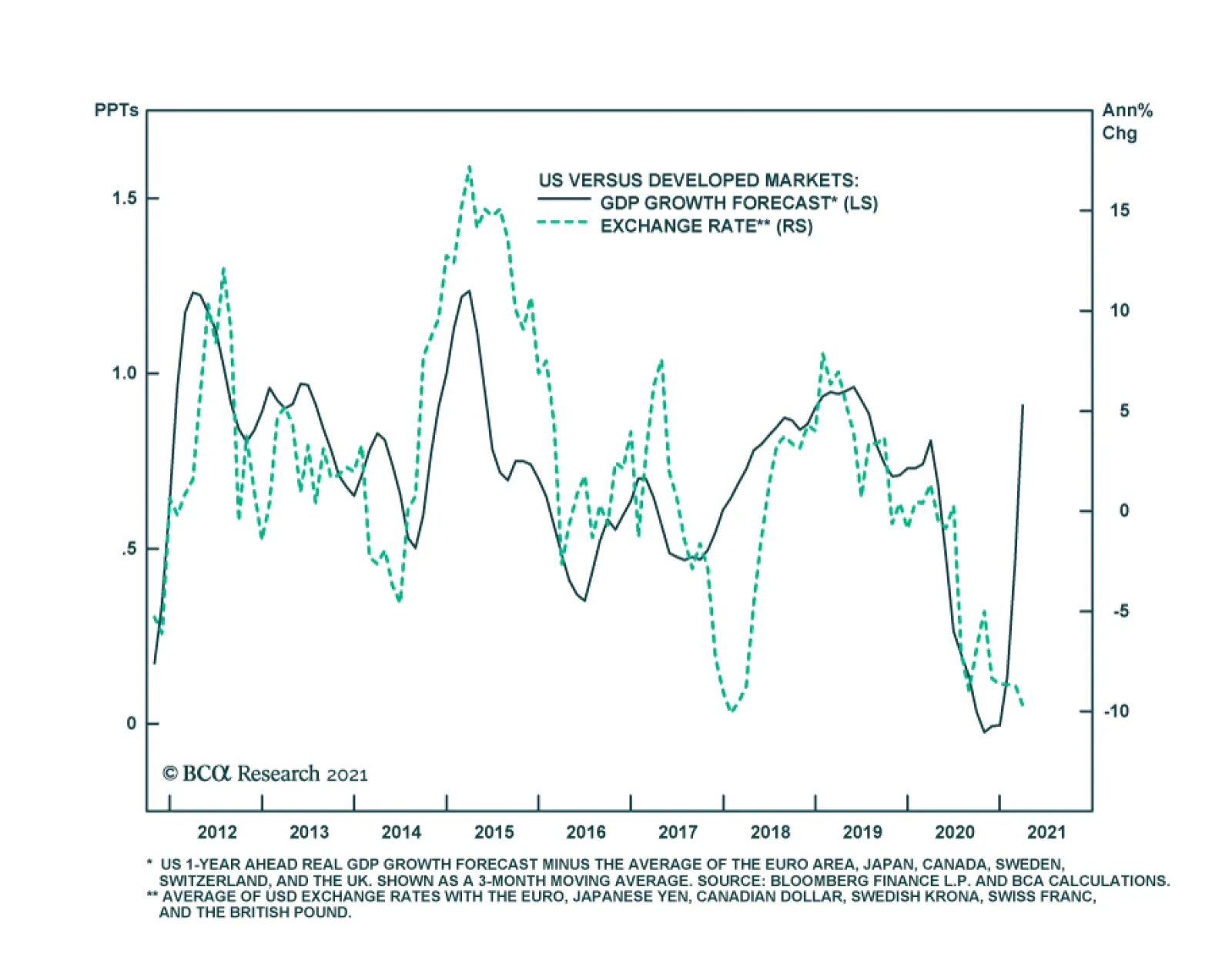 If we look at simple, crude measures of geopolitical risk we can see the market awakening to the new wall of worry for this business cycle – Great Power struggle, the persistence of “America First” with a different figurehead, China policy tightening, and a vacuum of European leadership. The US dollar is rising, developed market equities are outperforming emerging markets, safe-haven currencies are ticking up against commodity currencies, and gold is perking back up (Charts 1A & 1B). The cyclical upswing should reverse most of these trends over the medium term but investors should be cautious in the short term. US Stimulus, Chinese Tightening, And The Greenback The US remains the world’s preponderant power despite its political dysfunction and economic decline relative to emerging markets. The US has struggled to formulate a coherent way to deal with declining influence, as shown by dramatic policy reversals toward Iraq, Iran, China, and Russia. The pattern of unpredictability will continue. The Biden administration’s longevity is unknown so foreign states will be cautious of making firm commitments, implementing deals, or taking irrevocable actions. This does not mean the Biden administration will have a small impact – far from it. Biden’s national policy seeks to fire up the American economy, refurbish alliances, export liberal democratic ideology, and compete with China and Russia. The firing up is largely already accomplished – the American Rescue Plan Act (ARPA) and Biden’s forthcoming “Build Back Better” proposals will ultimately rank with Johnson’s Great Society. The Fed estimates that US GDP growth will hit 6.5% this year, higher than the consensus of economic forecasts estimates 5.5%, driven by giant government pump-priming (Chart 2). The US, which is already an insulated economy, is virtually inured to foreign shocks for the time being. Chart 2US Injects Steroids