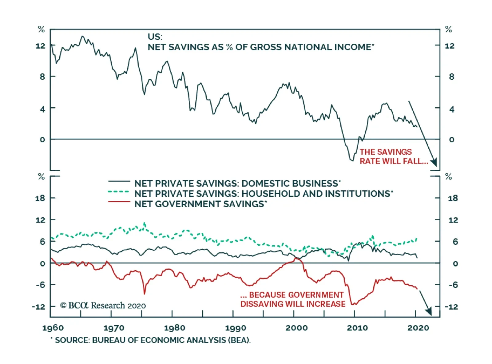 The national savings rate is a function of savings by households, corporations and the government. For now, the US national savings rate remains well behaved: The explosion of the fiscal deficit has been met by a counterbalancing surge in the household…