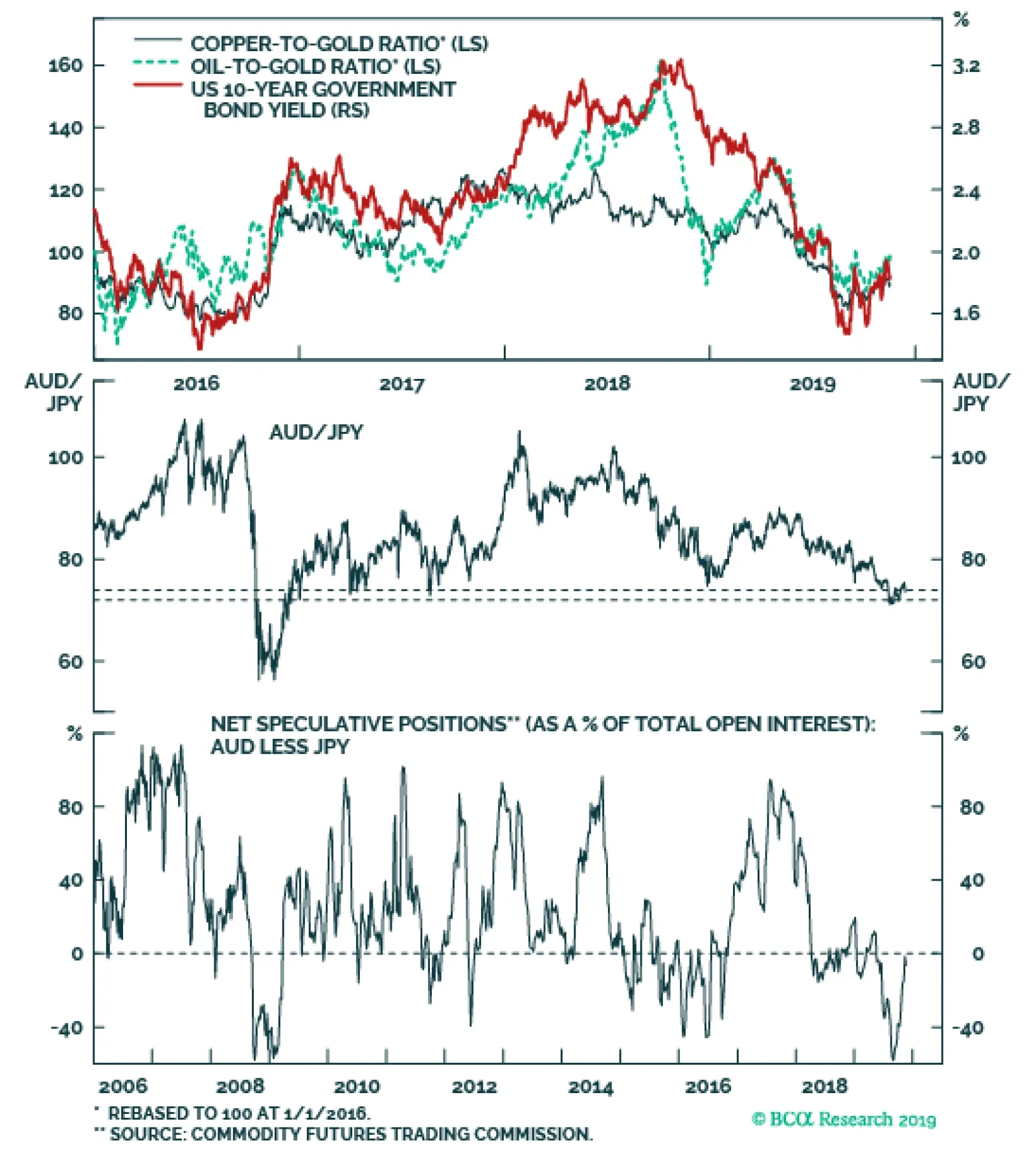 Correspondingly, in China, scrap steel prices have begun to rise faster than imported iron ore prices, suggesting an improving margin for steel producers. This is probably an indication that steel destocking has reached a nadir (Chart I-8). A renewed restocking cycle should benefit iron ore and other commodity imports and prices. In sympathy, the LMEX index appears to be making a tentative trough. AUD/JPY breached the important technical level of 72 cents this year but has since recovered. The cross has failed to sustainably break below this level both during the euro area debt crisis in 2011-2012 and the China slowdown in 2015-2016. Again, it appears reflation is winning the tug-of-war. Given speculators are neutral the cross, it suggests that any move either way will be powerful and significant (Chart I-9). Chart I-8Bullish Bottom-Up Signals From Metals