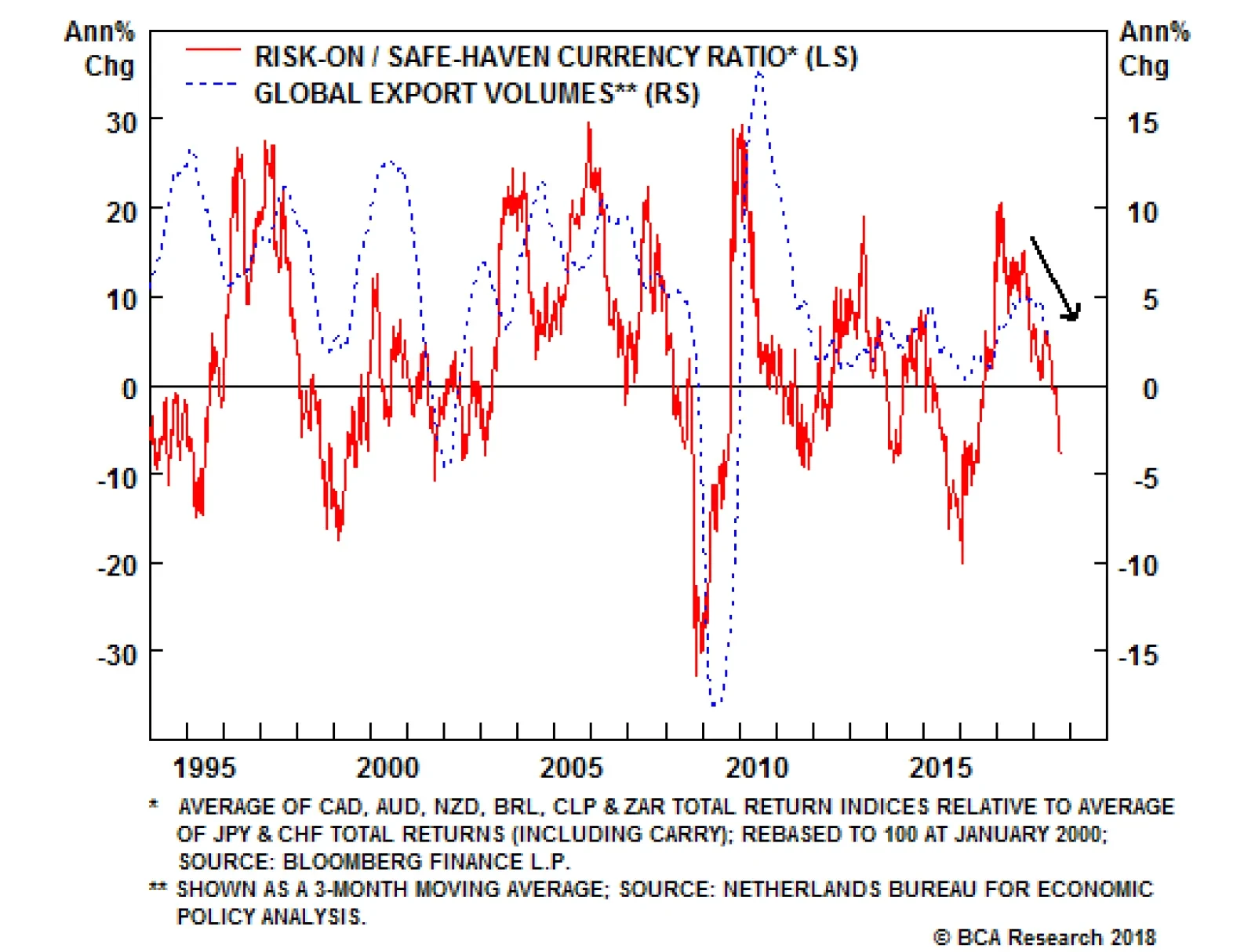 Currency markets can be used as signals for future growth expectations. The above chart shows that the relative performance of risk-on and risk-off currencies foreshadow further downside for global trade. More importantly, currency markets play an…