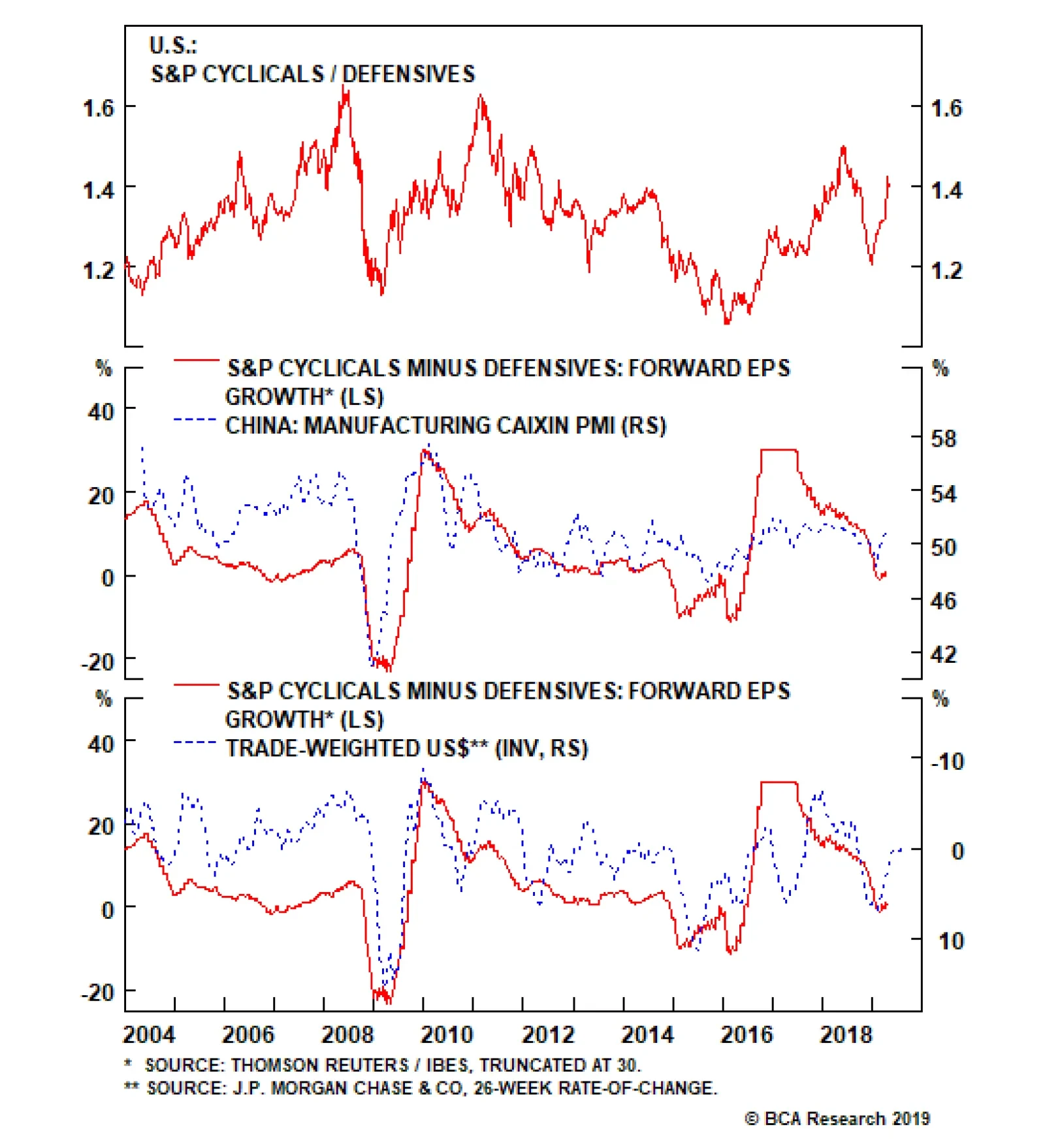 Overweight Cyclicals Over Defensives We were early and right in January when we posited that China’s slowdown was yesteryear’s story and more than discounted in the collapse of the U.S. cyclicals vs. defensives…