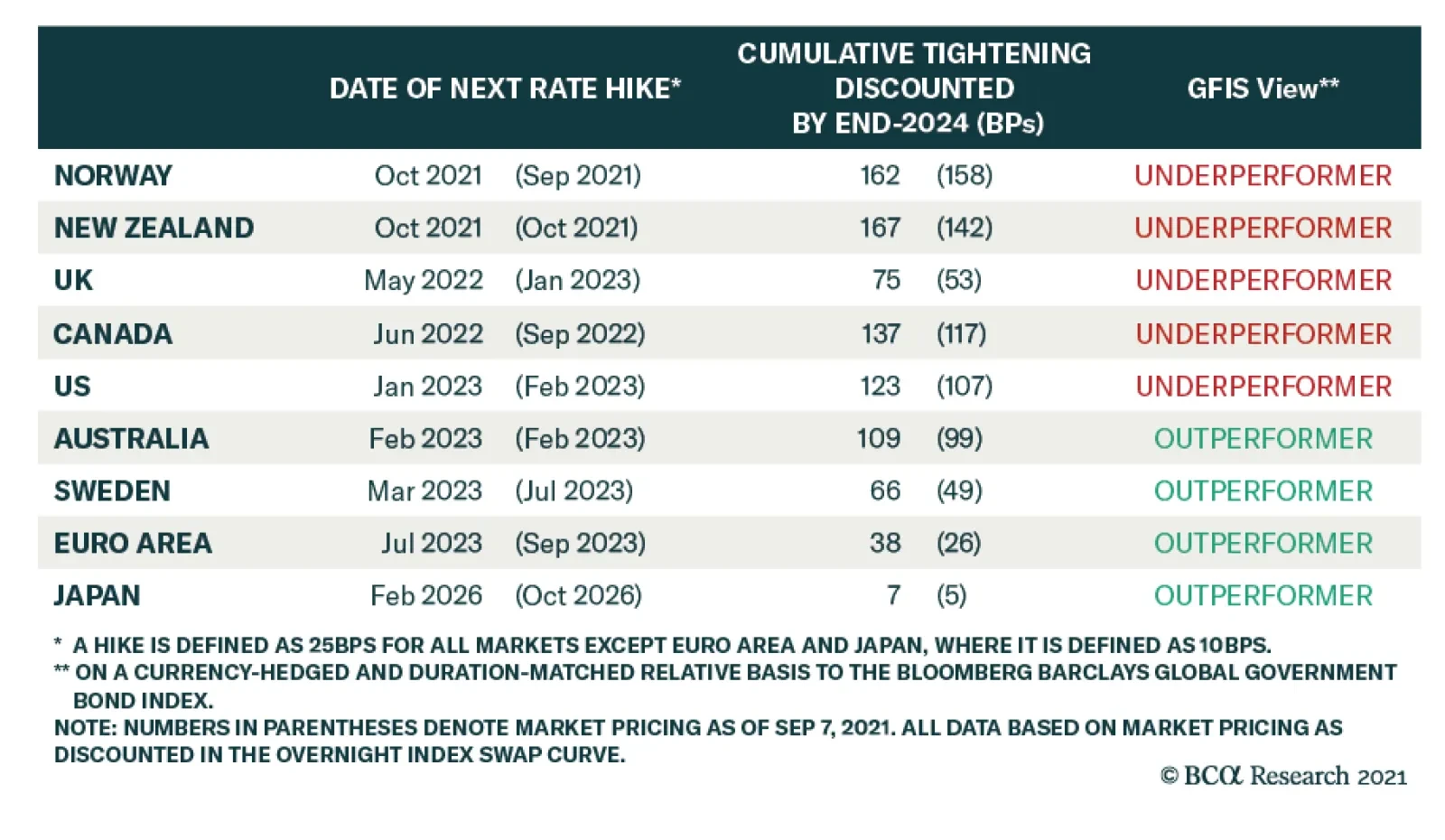 BCA Research’s Global Fixed Income Strategy service recommends investors underweight government bonds where markets are discounting a path for future policy rates over the next two years that is too flat: the US, UK, Canada…