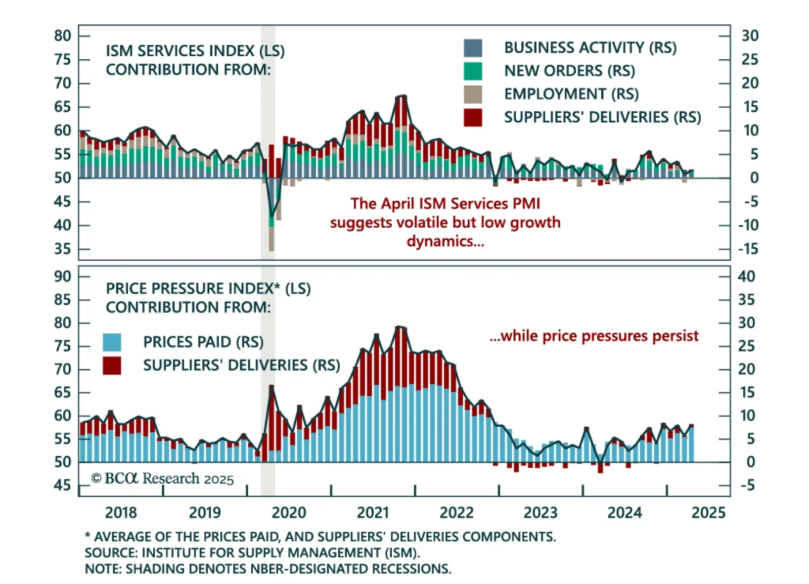 April’s ISM Services upside surprise does not shift our defensive stance, as its components show mixed momentum and rising price pressures. The headline index beat estimates, rising to 51.6 from 50.8. Business activity and new orders…