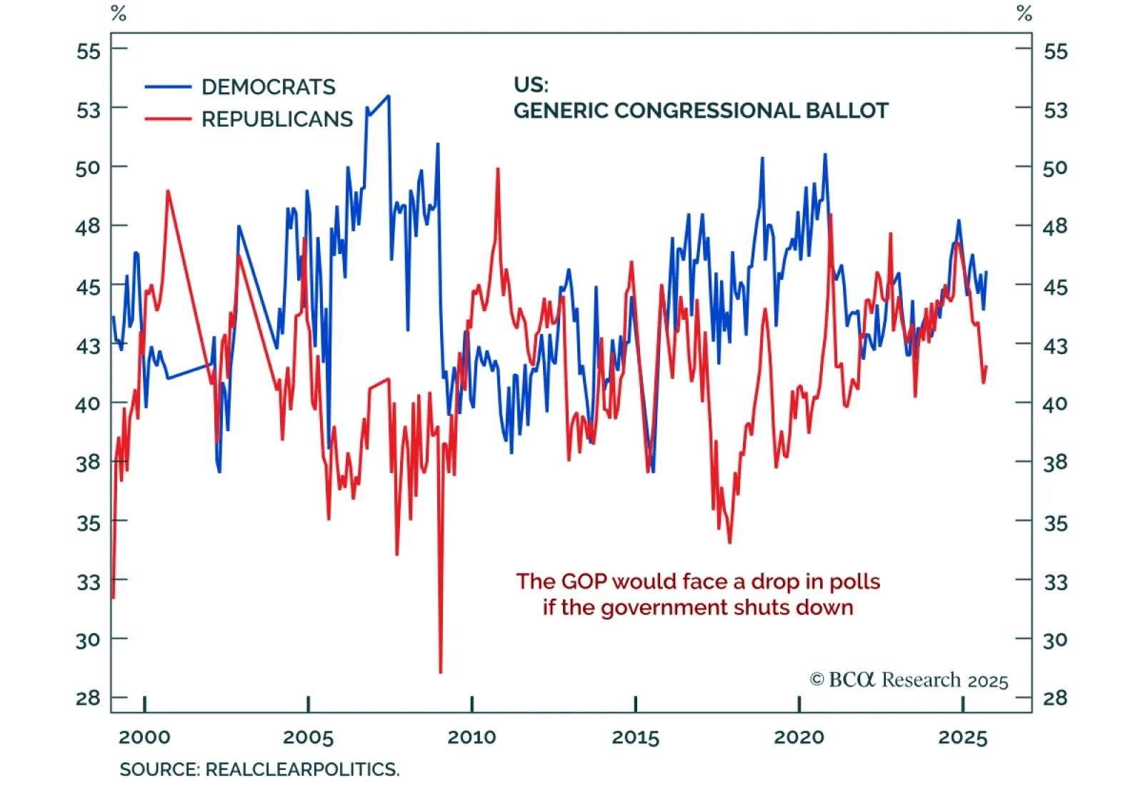 We give a one-third probability of a federal government shutdown. It probably will not happen before November. At worst, government shutdowns only cause temporary market volatility.