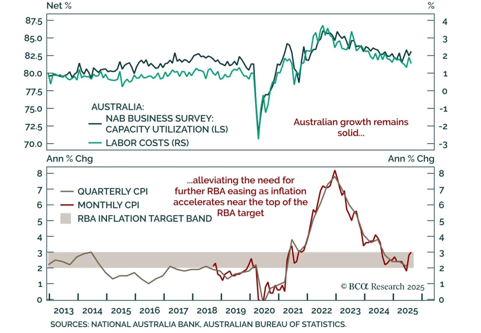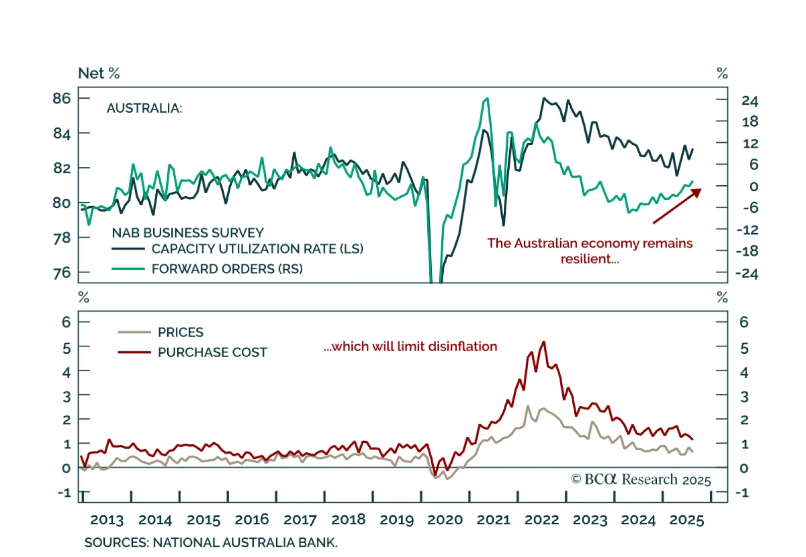 Australia’s NAB survey shows underlying resilience, reinforcing our underweight on ACGBs and the case for AUD flatteners vs. CAD steepeners. The August survey was mixed, with current conditions improving to 7 from 5, while business…
