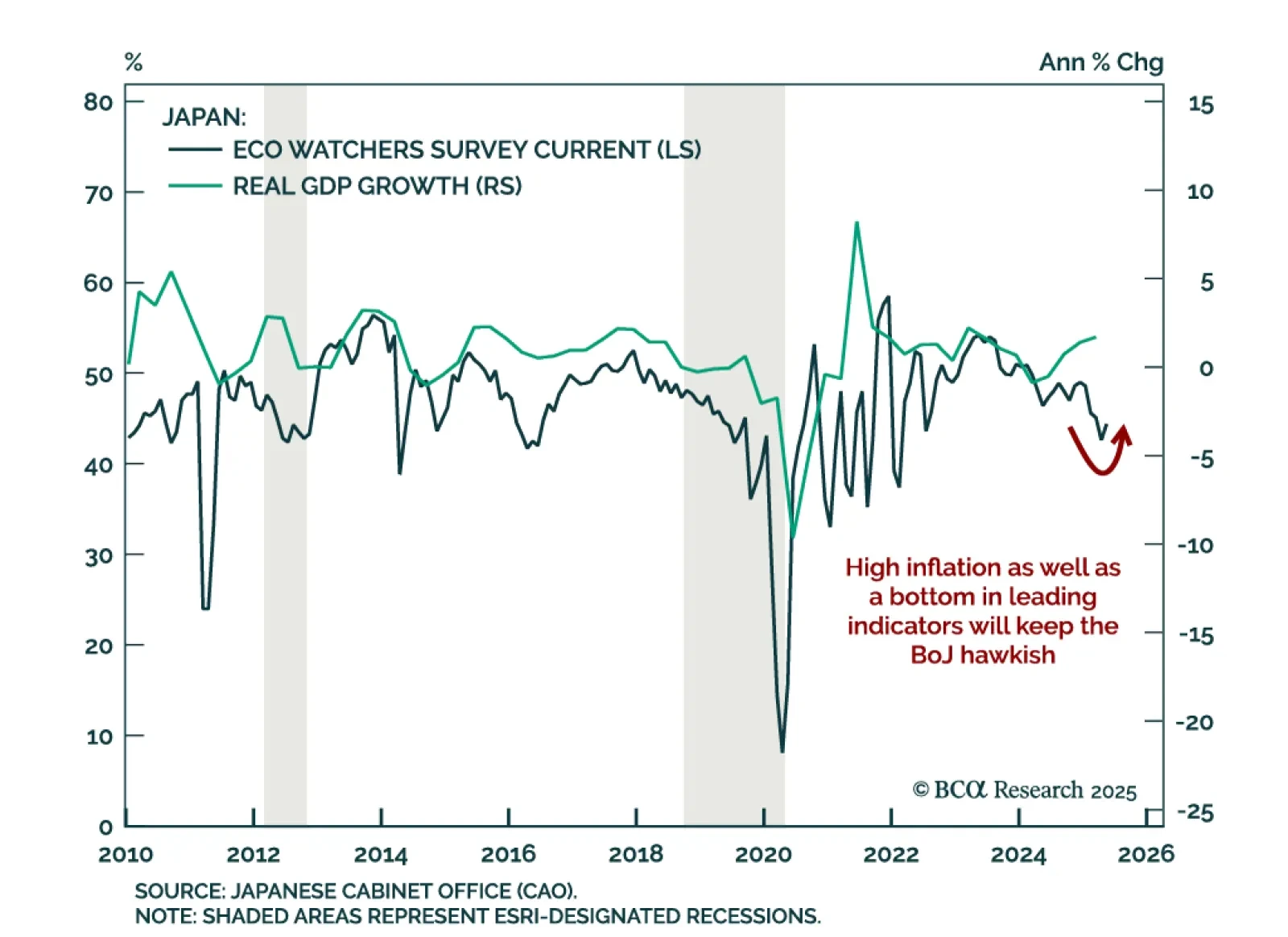 The BoJ will stay hawkish because of sticky inflation and better economic momentum. The May Eco Watchers Survey beat expectations, with current conditions rising to 44.4 and the outlook to 44.8. These levels still signal…