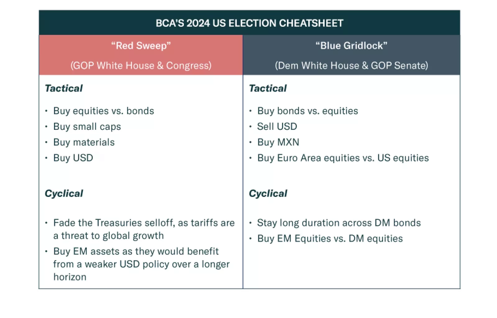 Trump may be favored, but Harris is now underrated. The Senate is highly likely to go Republican – Harris would be gridlocked if she pulled off a victory. If Trump wins it will be a full sweep. Expect volatility in the short term.