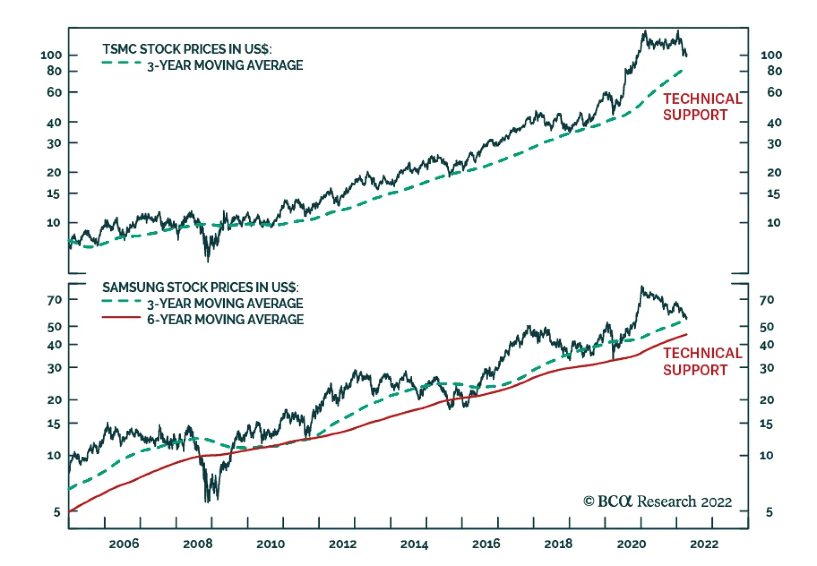 BCA Research’s Emerging Markets Strategy service expects Taiwanese and Korean semi stock prices to continue falling in absolute terms. Interestingly, since early 2021 TSMC and Samsung share prices have exhibited…