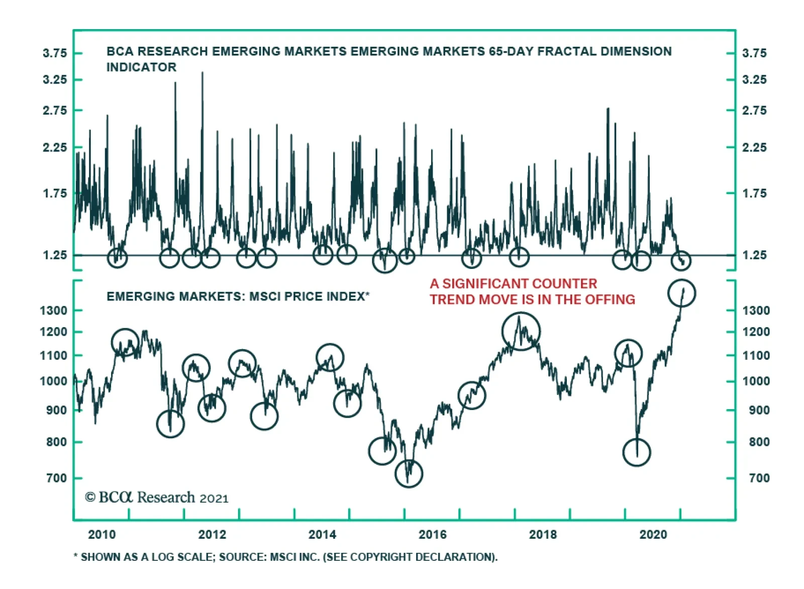 EM equity prices have experienced a spectacular rise since last year’s trough and hit a new all-time high. However, BCA Research’s Fractal Dimension indicator is flashing a warning sign for EM stocks. A reading below…