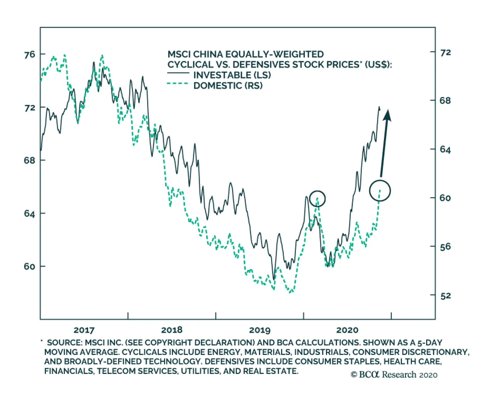 The chart above presents the relative performance of Chinese cyclicals versus defensives for both the investable and domestic markets. Here, cyclical and defensive sectors are equally-weighted within each index, so as to avoid…