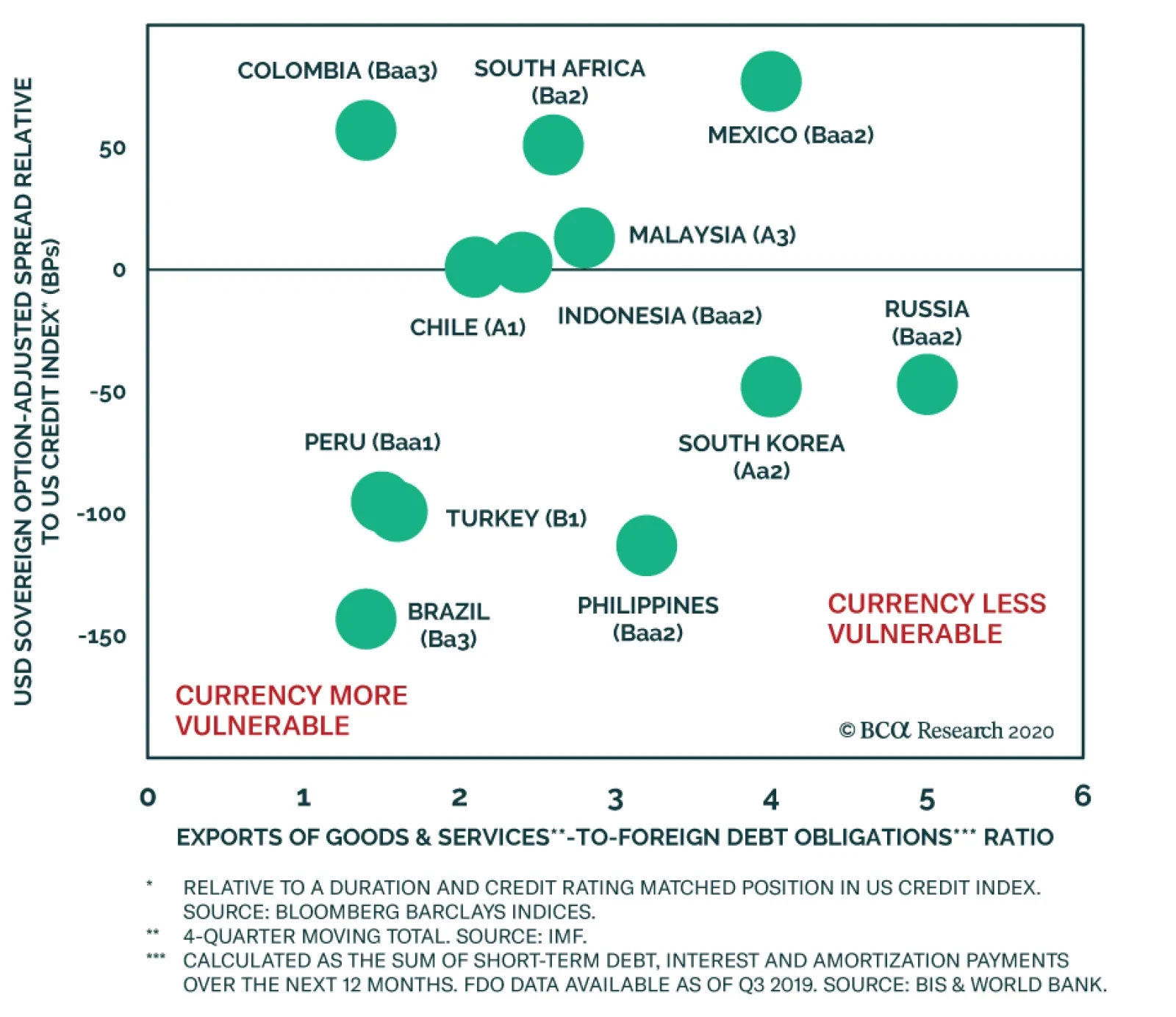 BCA Research's US Bond Strategy service recommends that US bond investors should avoid USD-denominated EM sovereign debt and focus instead on US corporate credit-rated Ba and higher. Of the EM countries with large USD bond…